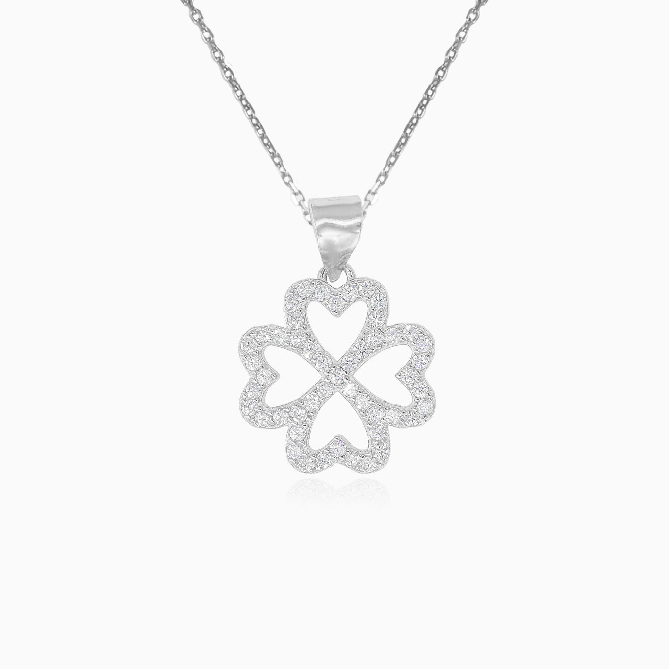 Colgante de plata de ley para mujer con un elegante diseño de flor de trébol, adornado con circonitas cúbicas brillantes en talla redonda fina escalonada. Cada piedra está engastada con precisión en un engaste de garra, creando una pieza atemporal perfecta para añadir brillo a cualquier conjunto.