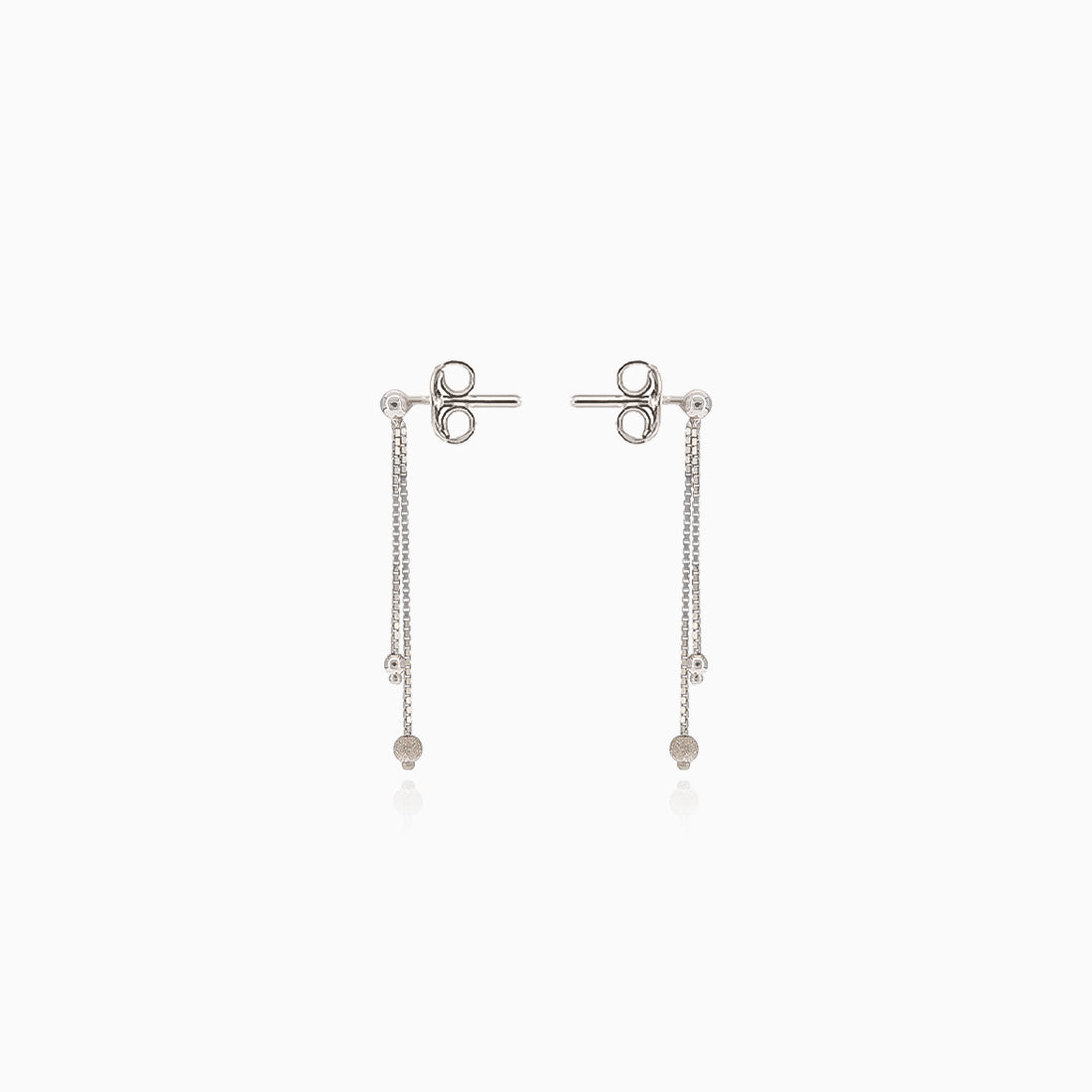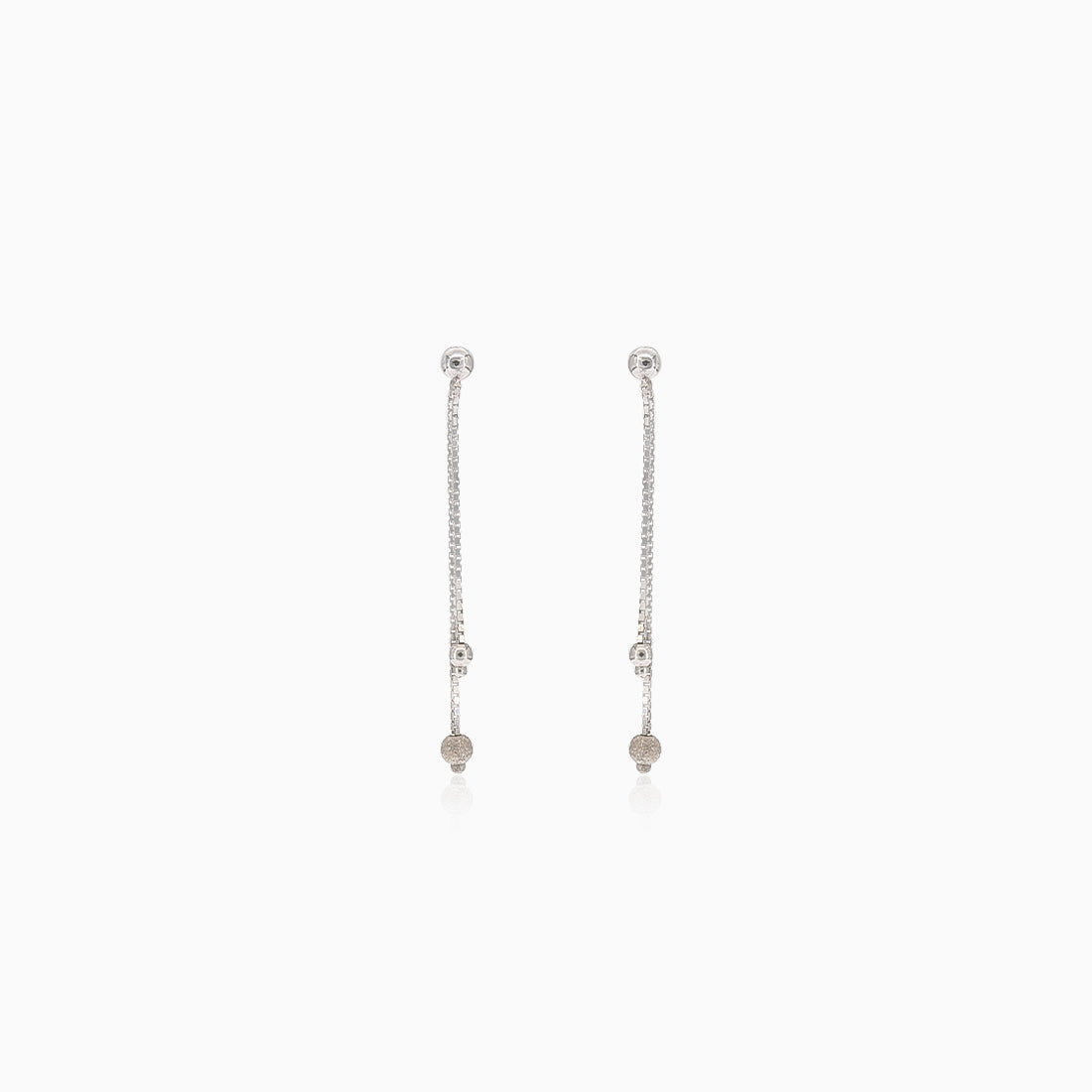 Estos pendientes de oro blanco de 14kt presentan un diseño único con dos cadenas cautivadoras, cada una terminando en una bola y conectadas por otra bola. Ambos pendientes se aseguran con cierre mariposa.