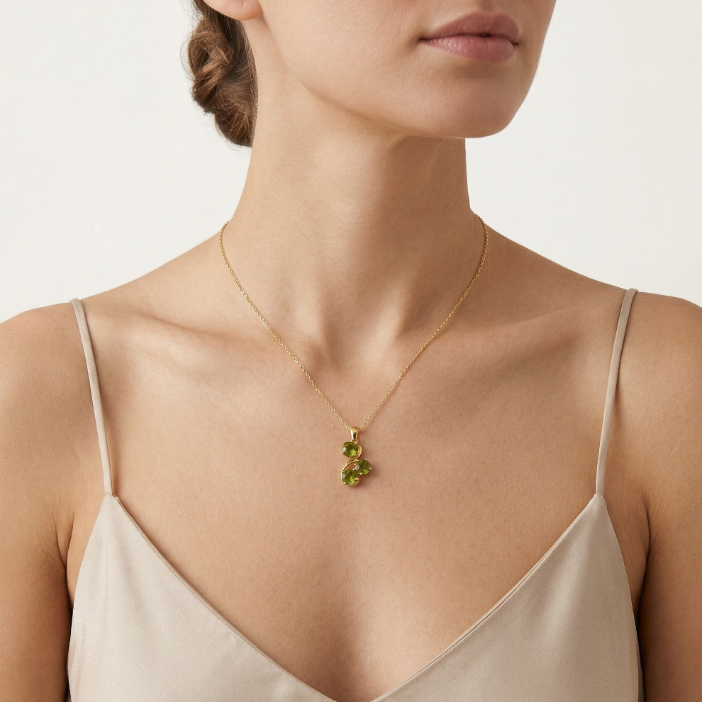 Disfruta de la exquisita belleza de nuestro colgante con tres bolas de moldavita en forma de racimo de uvas, en un engaste de oro amarillo de 14 quilates. La moldavita redonda talla escalonada fina está elegantemente asegurada en un engaste único de 4 garras, creando una pieza cautivadora que combina inspiración orgánica con encanto.