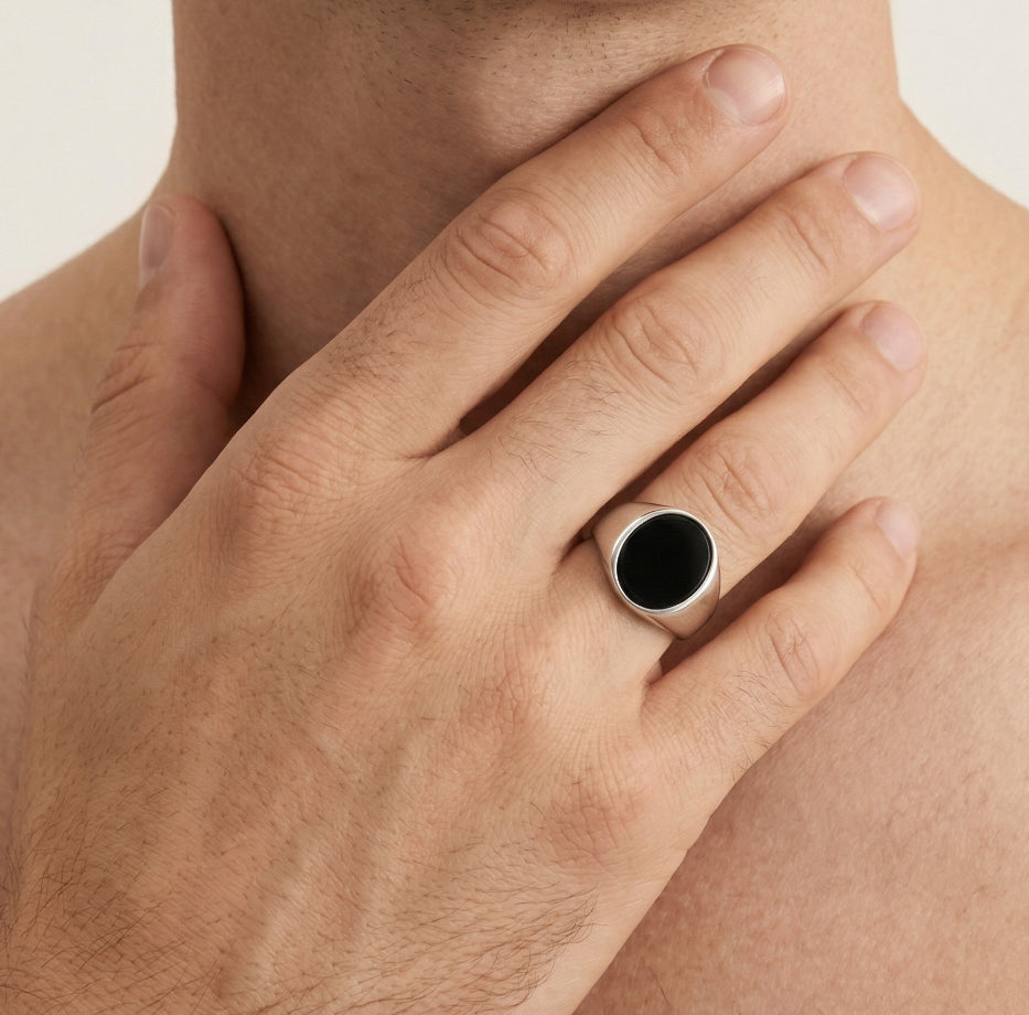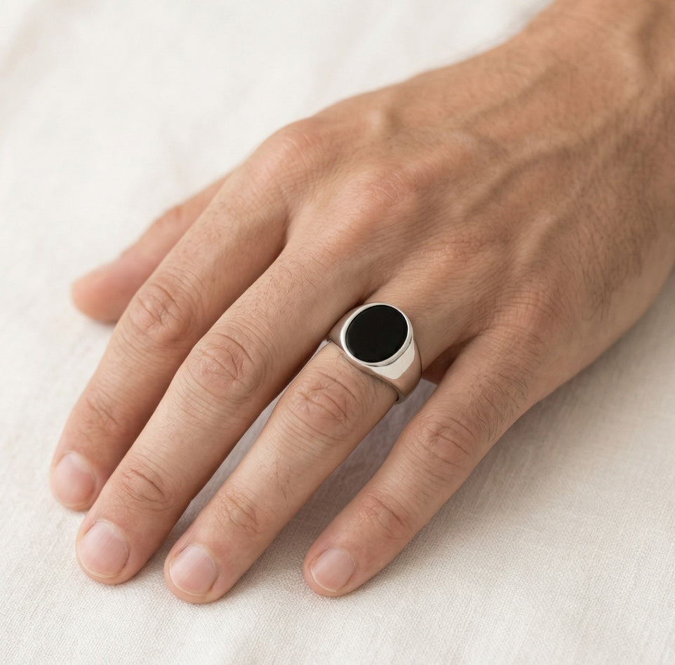 Pánský prsten s kulatým onyxem v leštěném stříbře