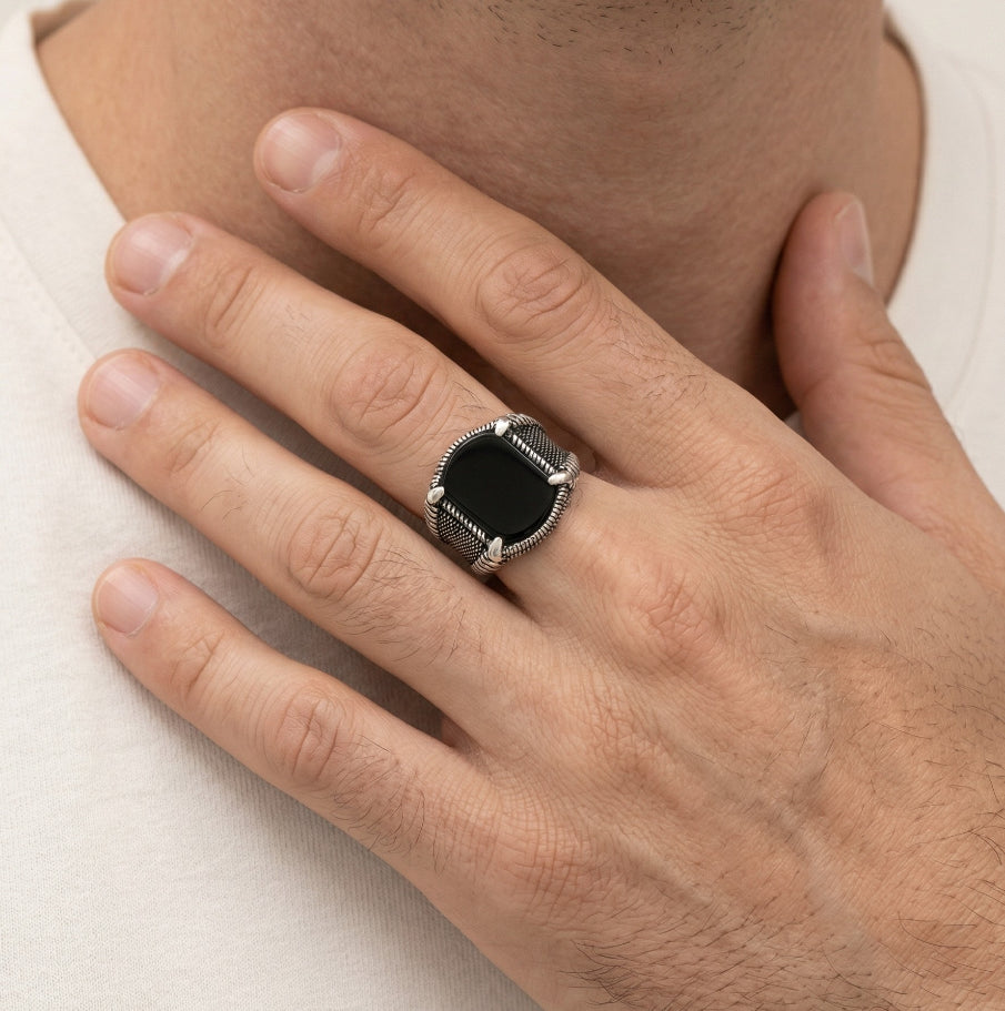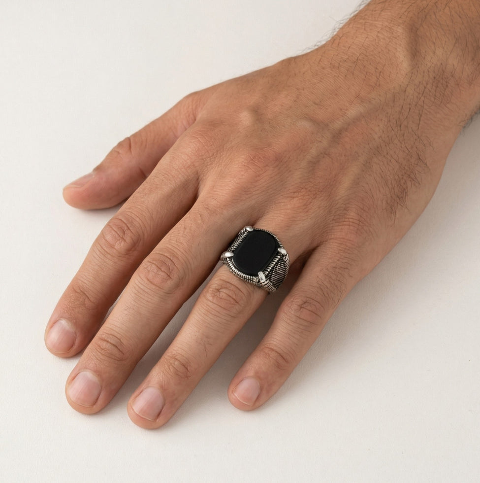 Tento výrazný pánský prsten zdobí působivý brus onyxu zasazený do robustního designu inspirovaného vikingskou estetikou. Hluboký černý kámen vytváří silný středový prvek, zatímco detailní kovové zdobení dodává prstenu charakter, sílu a symboliku. Ideální pro muže, kteří oceňují bojovnický styl a nadčasový výraz maskulinity — prsten, který na první pohled zaujme sebevědomou přítomností.