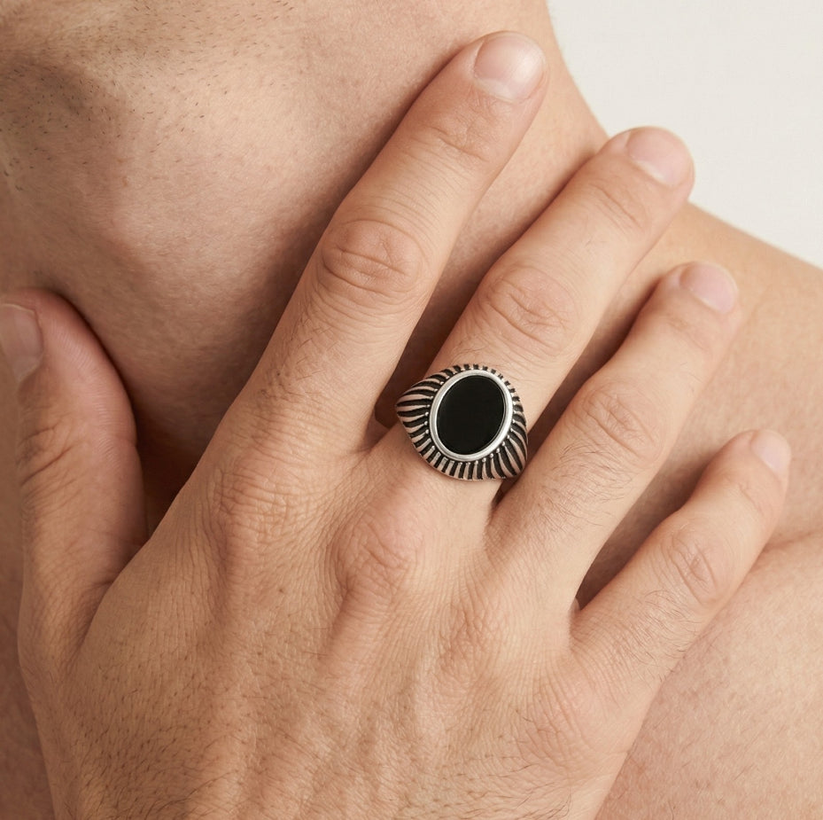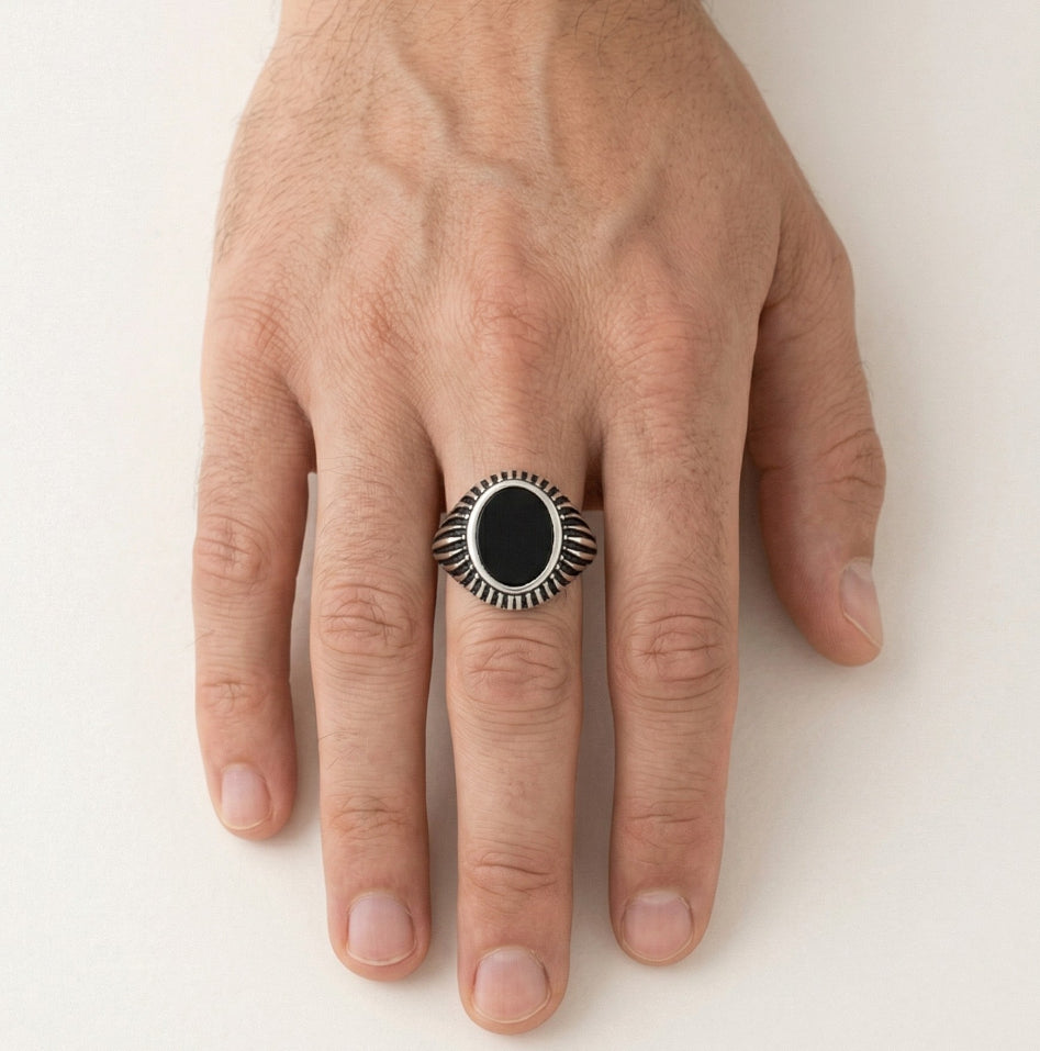 Pánský prsten s oválným onyxem a bočními liniovými detaily