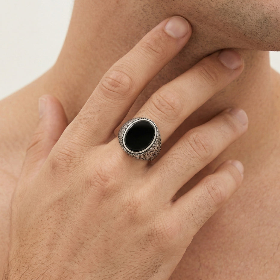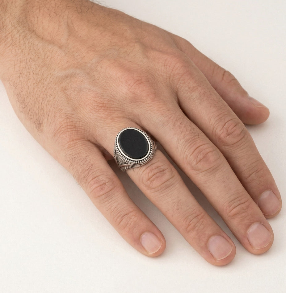 Ručně vyrobený pánský prsten s oválným onyxem