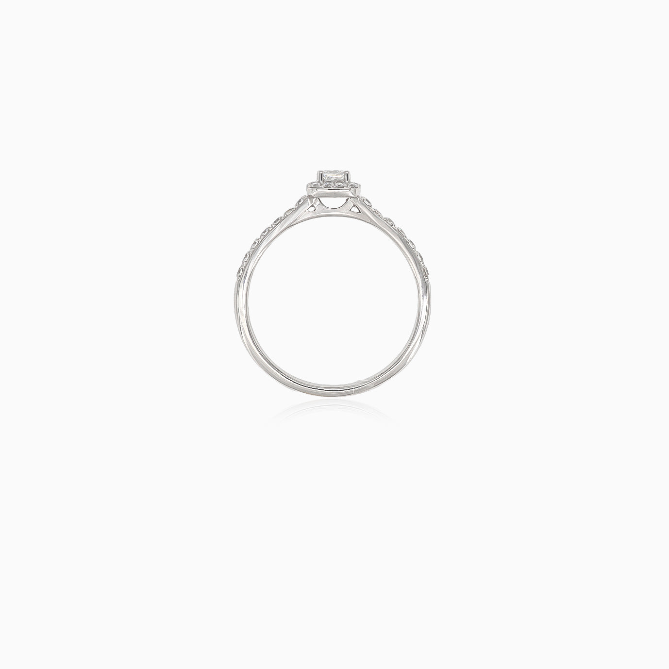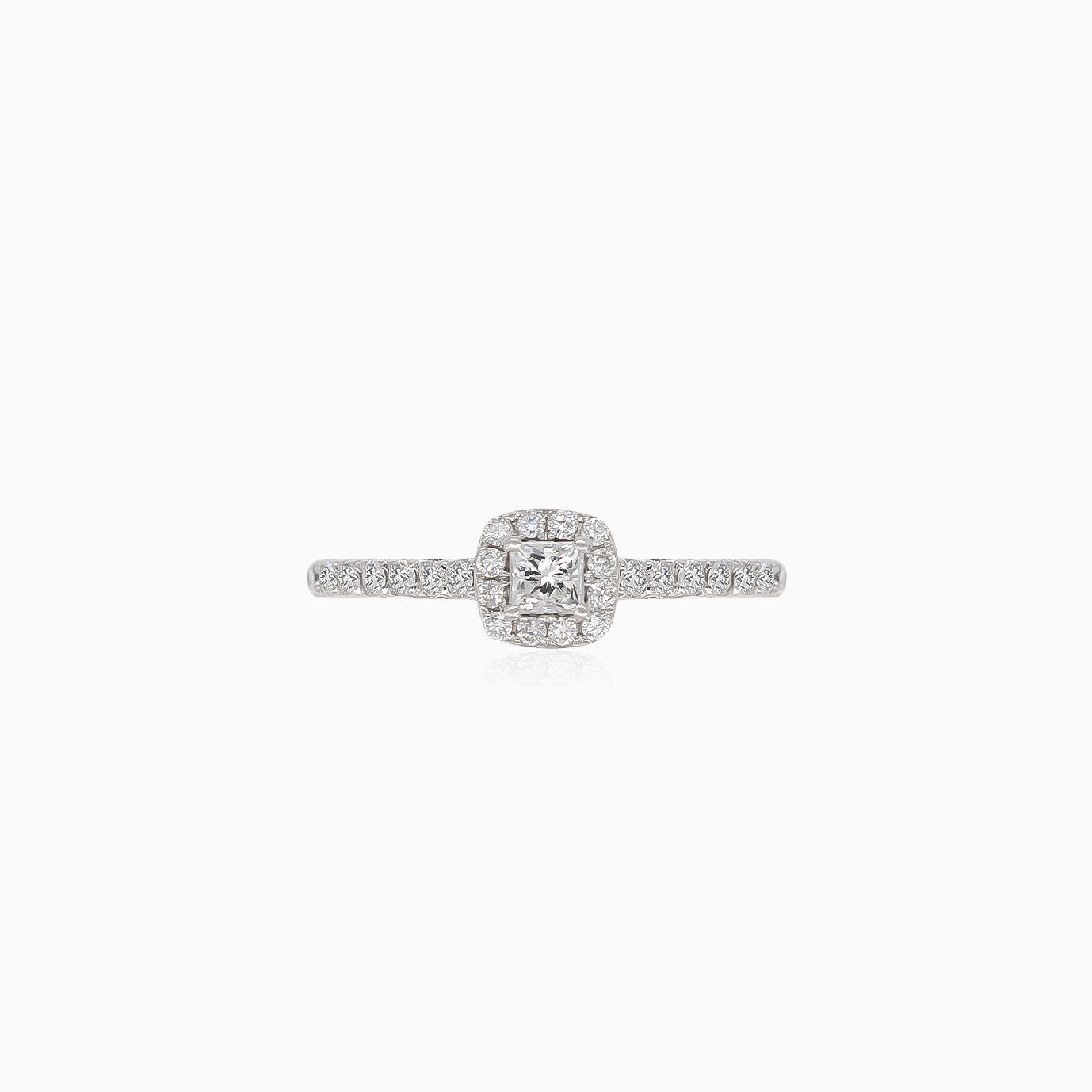 Cette élégante bague de fiançailles pour femme présente des diamants latéraux en taille fine étape ronde et une pierre centrale en taille princesse carrée, le tout monté sur un or blanc 14 carats avec un sertissage à griffes. Les diamants offrent une clarté SI1 et une couleur H, faisant de cette bague un symbole intemporel d'amour et d'engagement.