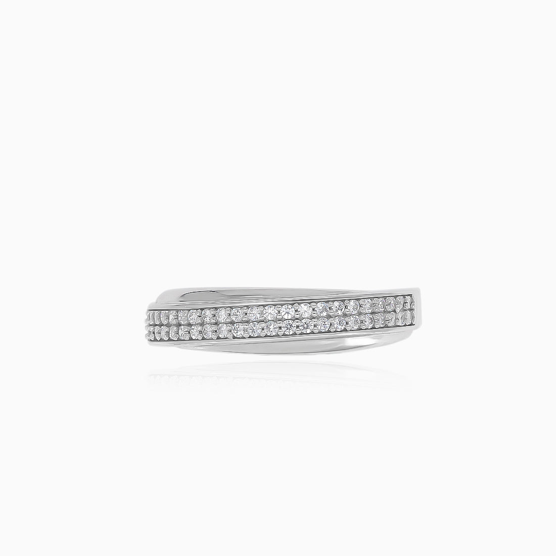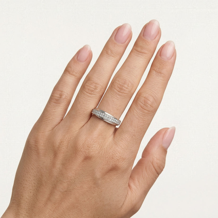 Cette élégante bague pour femme en or blanc 14 carats présente deux rangées de zircones cubiques rondes taille fine disposées en diagonale sur le bandeau. Le sertissage à griffes met en valeur l’éclat des pierres, tandis que le design unique apporte une touche moderne et élégante à toute tenue.