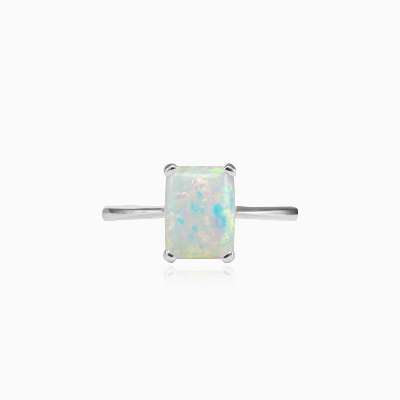 Cette bague pour femme en or blanc 14 carats présente une opale blanche taillée en cabochon rectangulaire, sertie dans une monture à griffes classique. Son design solitaire met en valeur la beauté naturelle de l'opale, offrant une pièce intemporelle et élégante qui complète tout style avec une touche de sophistication.