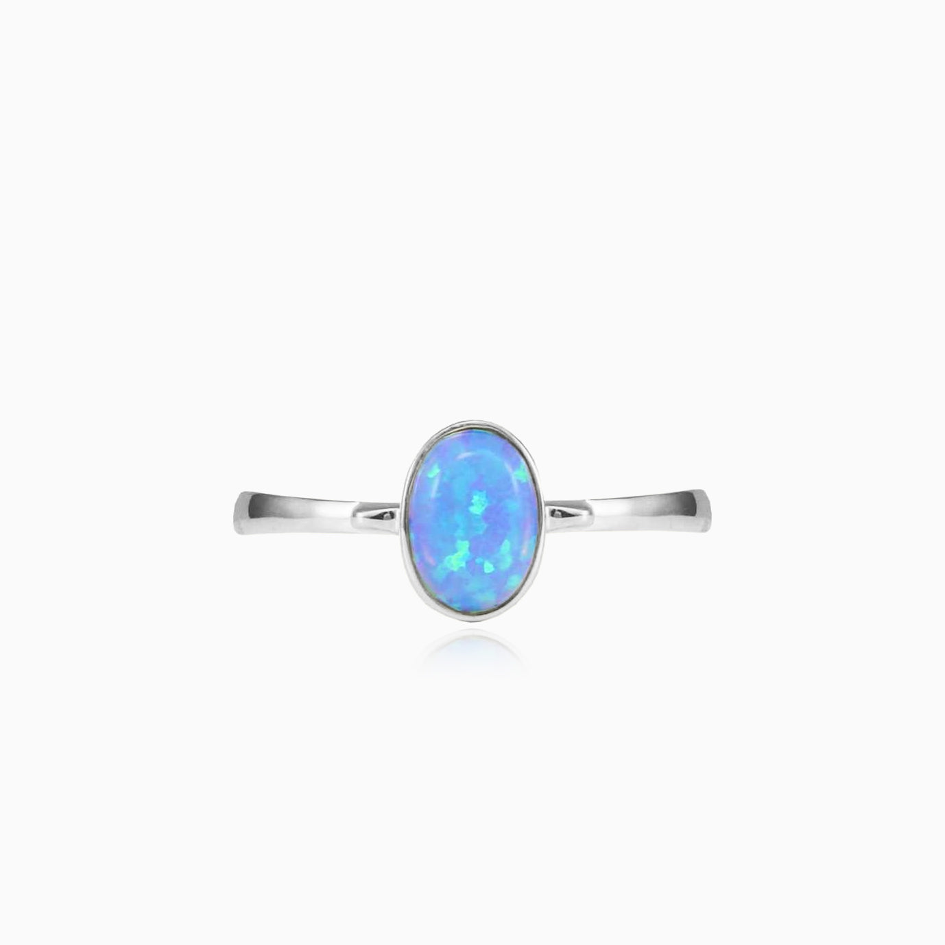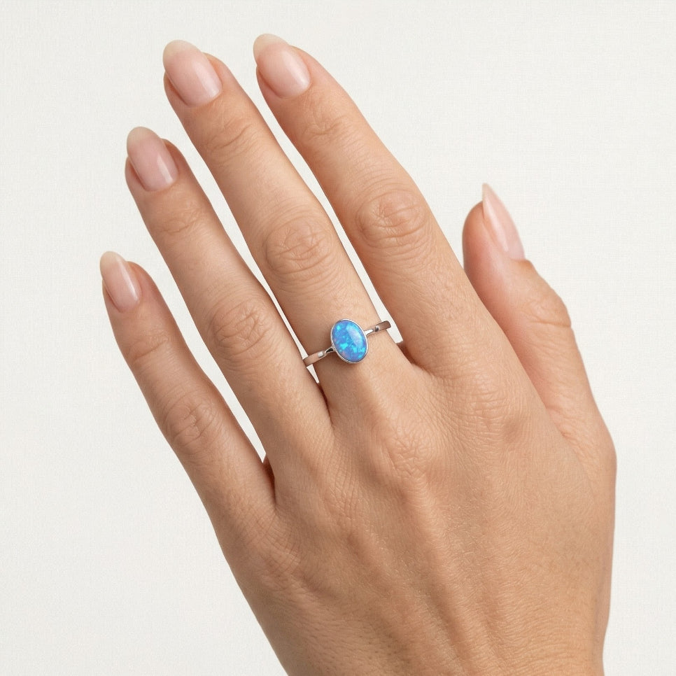 Cette bague pour femme en or blanc 14 carats présente une opale bleue taille cabochon ovale, sertie en chaton élégant. Son design solitaire simple met en valeur la beauté naturelle de l’opale, en faisant un choix raffiné pour une élégance discrète.