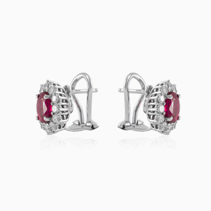 Paire de boucles d’oreilles royales combinant un rubis ovale entouré d’un halo de diamants blancs.