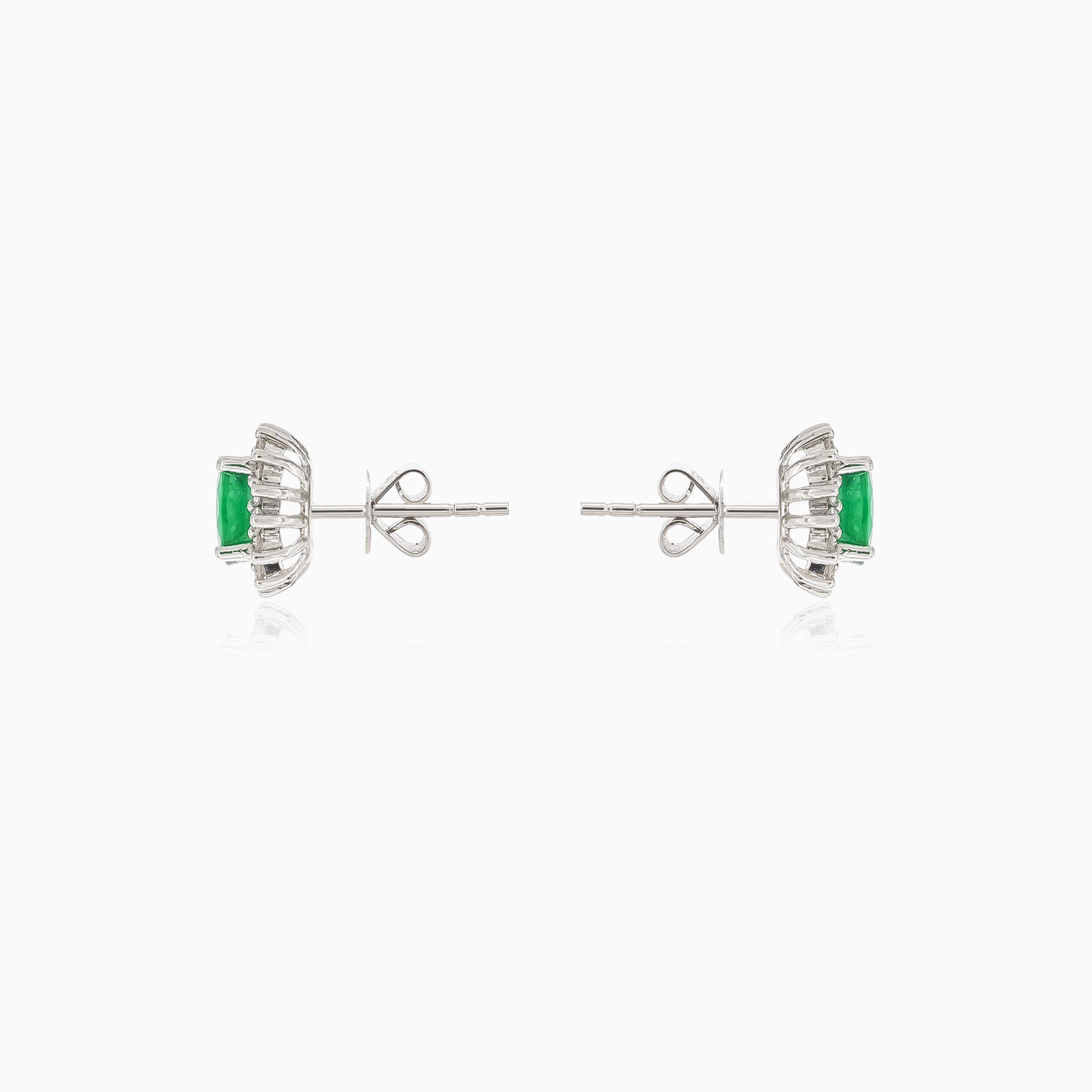 Élégantes boucles d’oreilles en or blanc 14 carats ornées d’une émeraude taille ovale de 1,15 ct dans un sertissage sécurisé à 4 griffes, entourée de diamants taille ronde de 0,35 ct en sertissage griffes partagées, avec un fermoir poussette. Les diamants présentent une pureté VS/SI et une couleur G.