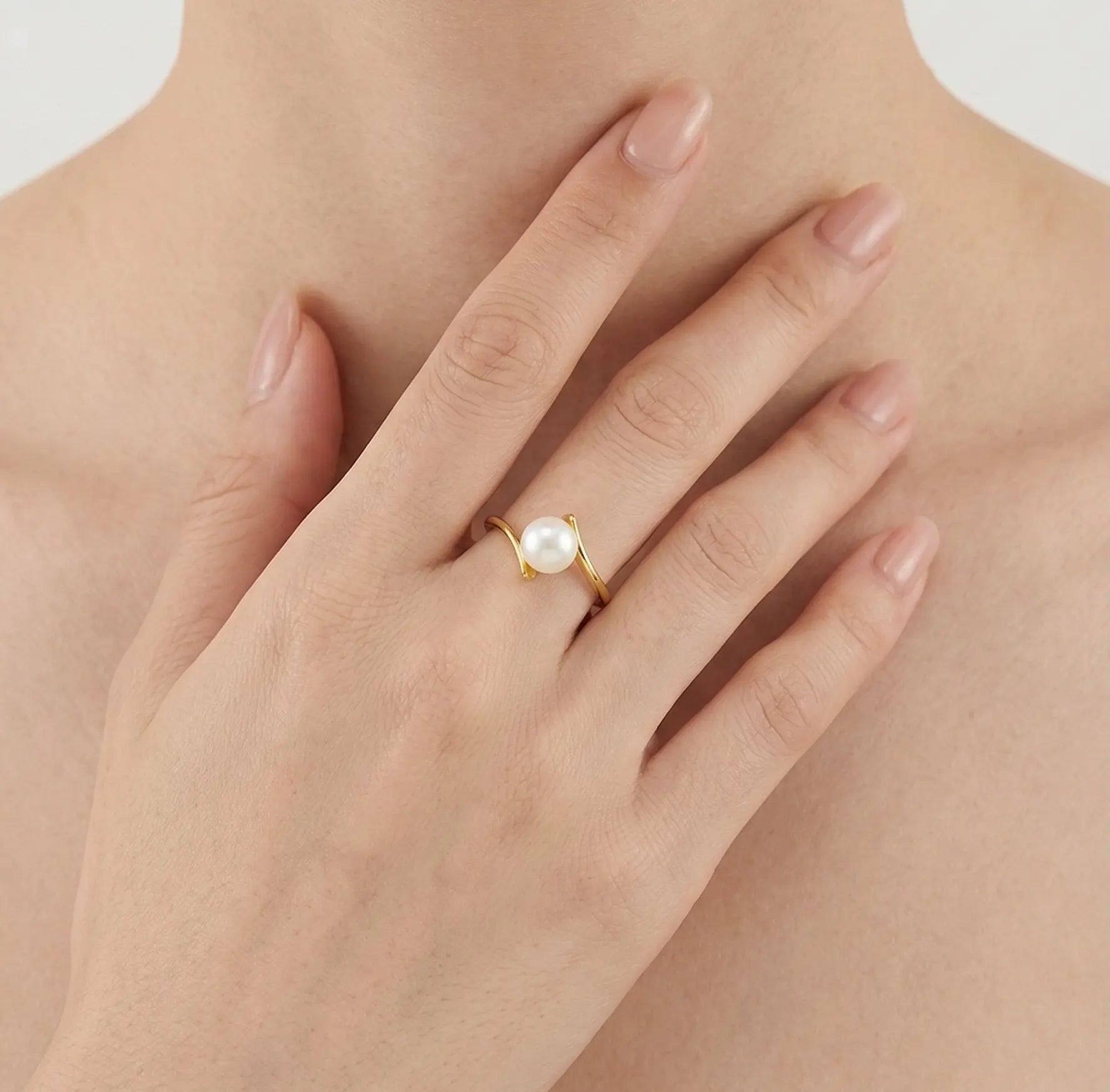 Bague torsadée en or jaune 14 carats, ornée d’une perle de 7,5 mm.