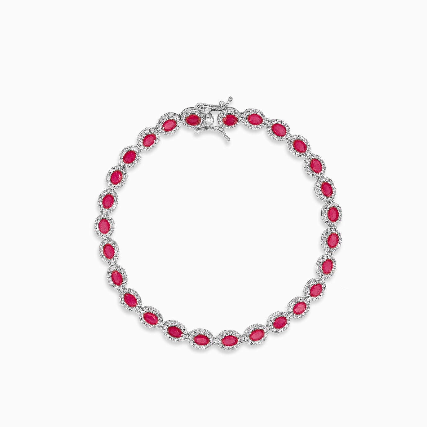 Adoptez l'élégance avec notre bracelet en argent, orné de pierres de rubis synthétiques taillées en ovales et en pas de vis fin, ainsi que de zirconiums cubiques taillés en pas de vis rond. Il est équipé d'un fermoir à boîte ouverte sécurisé et d'un serti à griffes.