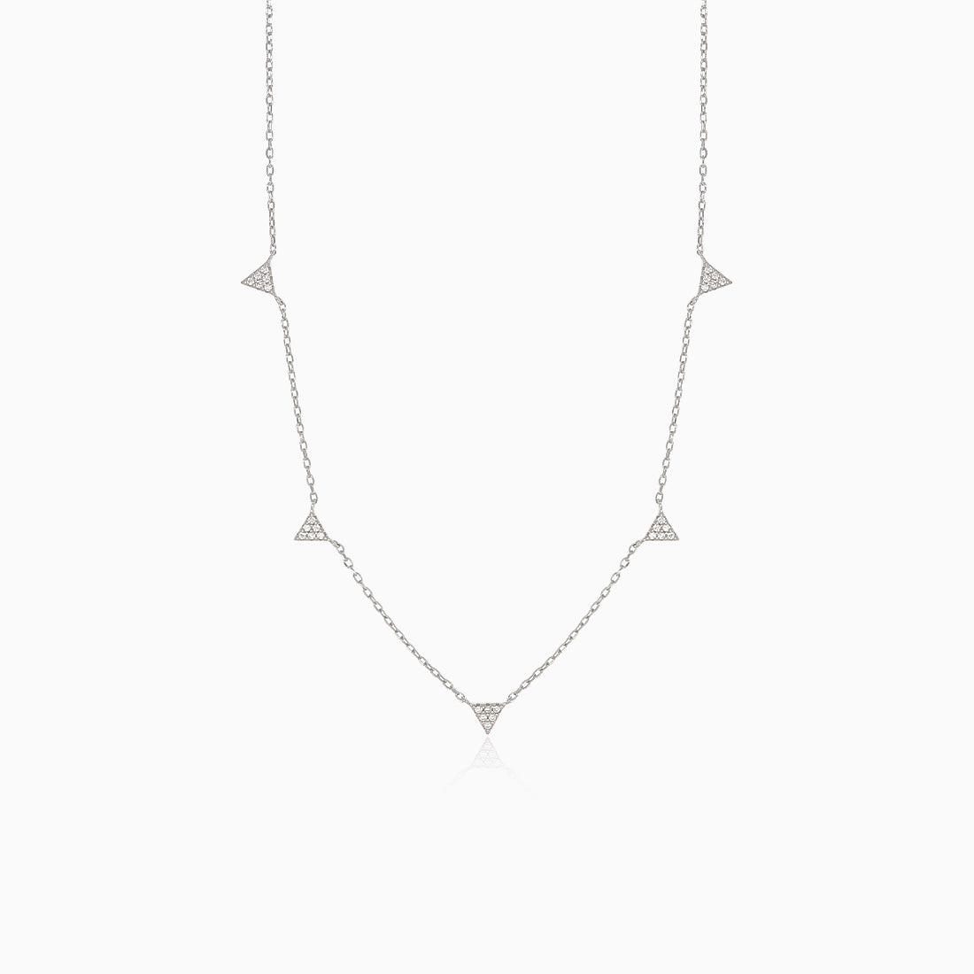 Confectionné en argent sterling 925, ce collier se distingue par ses cinq maillons en forme de triangle. Chaque triangle est orné de zircons cubiques ronds, ajoutant une touche d’éclat. La pièce offre une longueur ajustable et est dotée d’un fermoir à ressort.