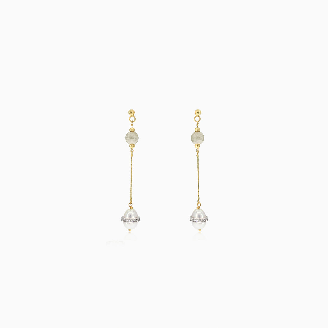 Confectionnées en or blanc et jaune 14 carats, ces somptueuses boucles d’oreilles pendantes mettent en valeur des perles ovales blanches d’eau douce en leur centre. Autour des perles, un halo de zircons cubiques ronds en serti griffes partagées apporte éclat et brillance. Le design est sublimé par des perles en or blanc sablé pour un scintillement supplémentaire. Fermoir poussette pour un port sûr et facile.