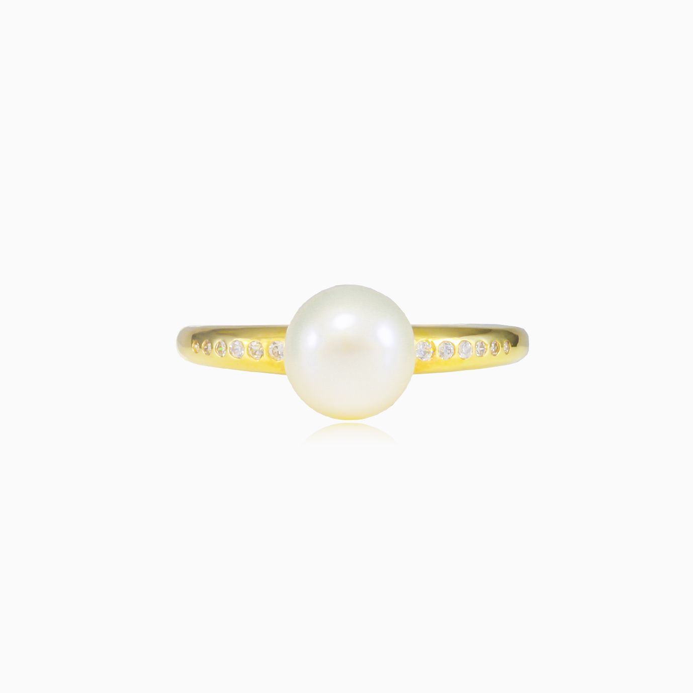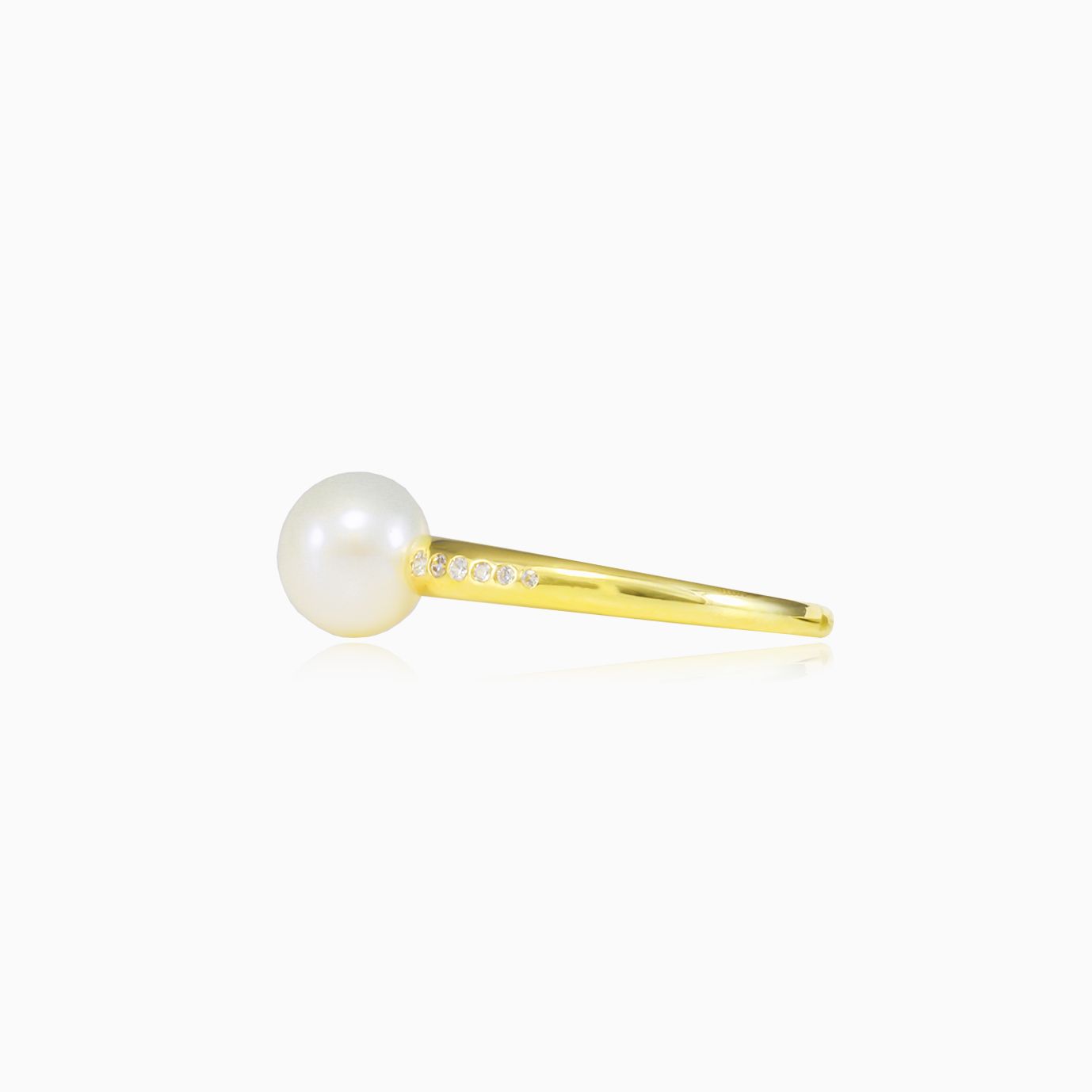 Bague perle accent en or jaune 14 carats, décorée de zircon cubique serti clos des deux côtés.