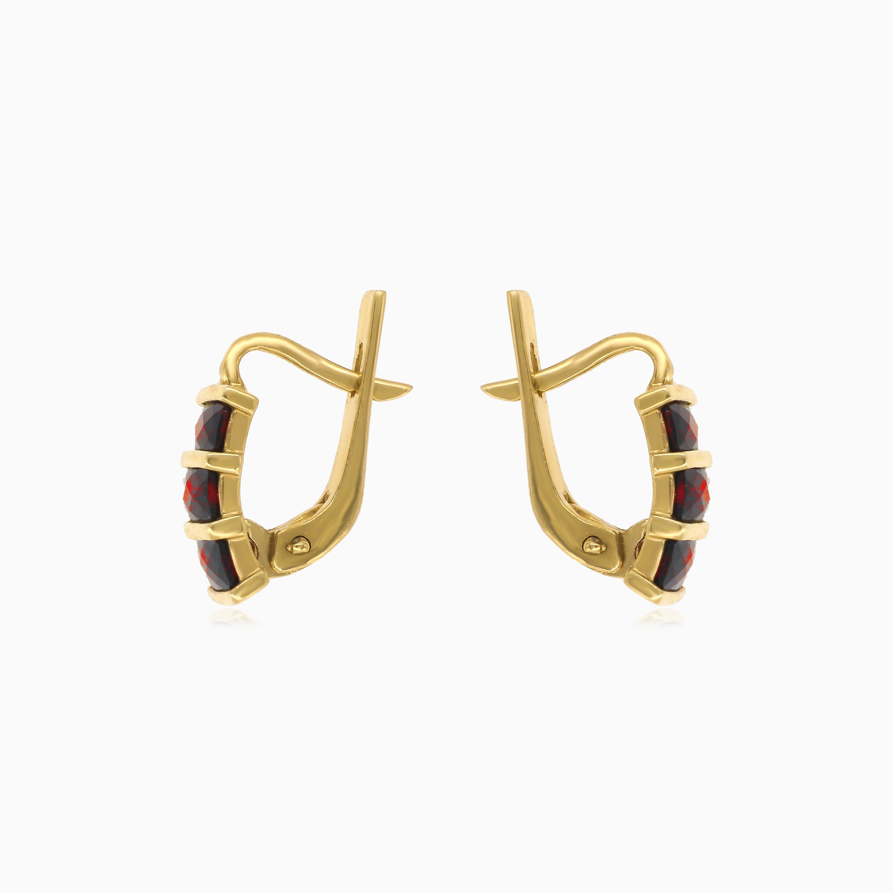 Sublimez votre style avec l'éclat envoûtant de nos boucles d'oreilles pendantes en or pour femme, mettant en valeur trois grenats taillés en rectangle radiant. Fabriquées en or jaune 14 carats avec un design épuré en barre et un fermoir à charnière, ces boucles d'oreilles allient sophistication moderne et beauté intemporelle. Adoptez ce trio radieux et apportez une touche d'harmonie dorée à votre collection.