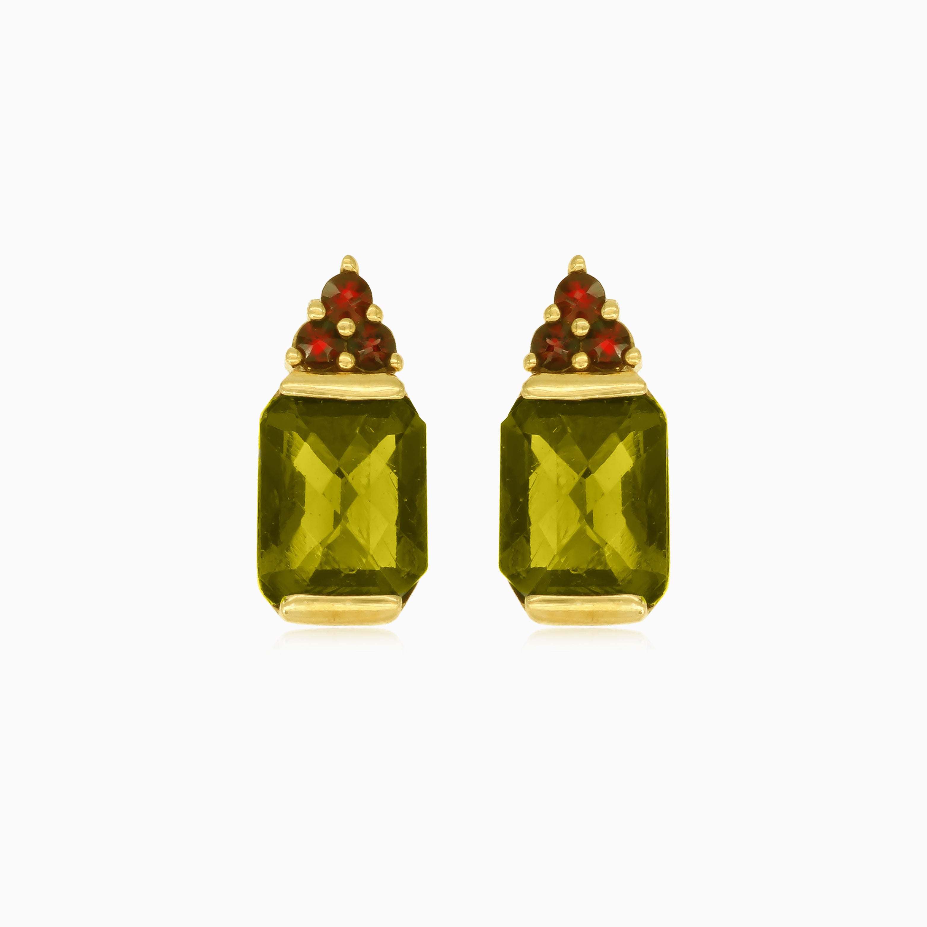 Sublimez votre style avec ces boucles d’oreilles pendantes en or jaune 14 carats, ornées d’un grenat rond à taille en escalier, serti par quatre griffes, et d’une moldavite taille radiant en serti barre. Elles sont dotées d’un fermoir à cliquet sécurisé, alliant élégance et sophistication dans un accessoire remarquable.