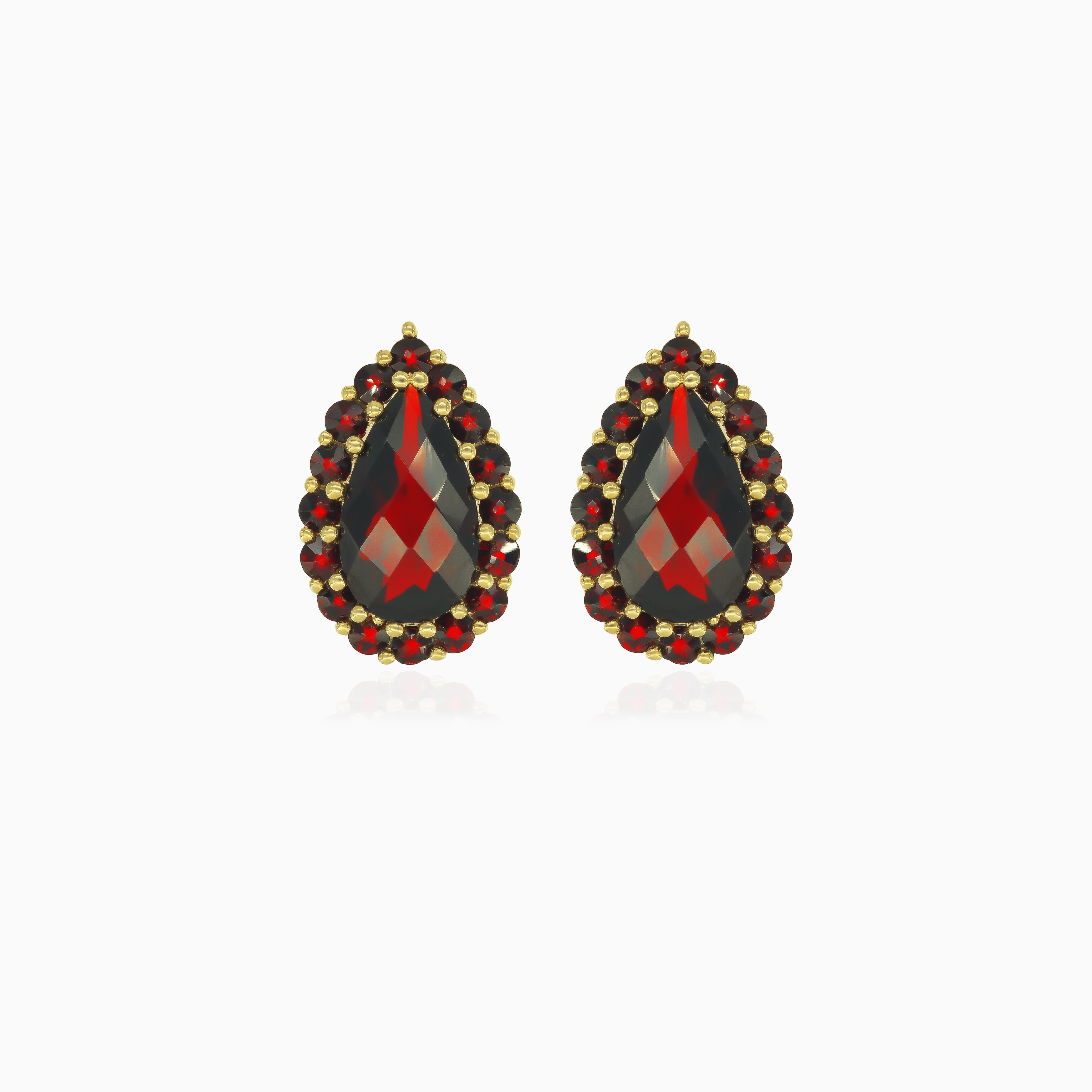 Plongez dans l’alliance parfaite des formes avec nos boucles d’oreilles pendantes en or jaune 14 carats, ornées de grenats taille fine à gradins poire et ronde. Le sertissage griffes partagées et le fermoir oméga renforcent leur éclat, créant une pièce harmonieuse qui rayonne d’élégance et de charme.