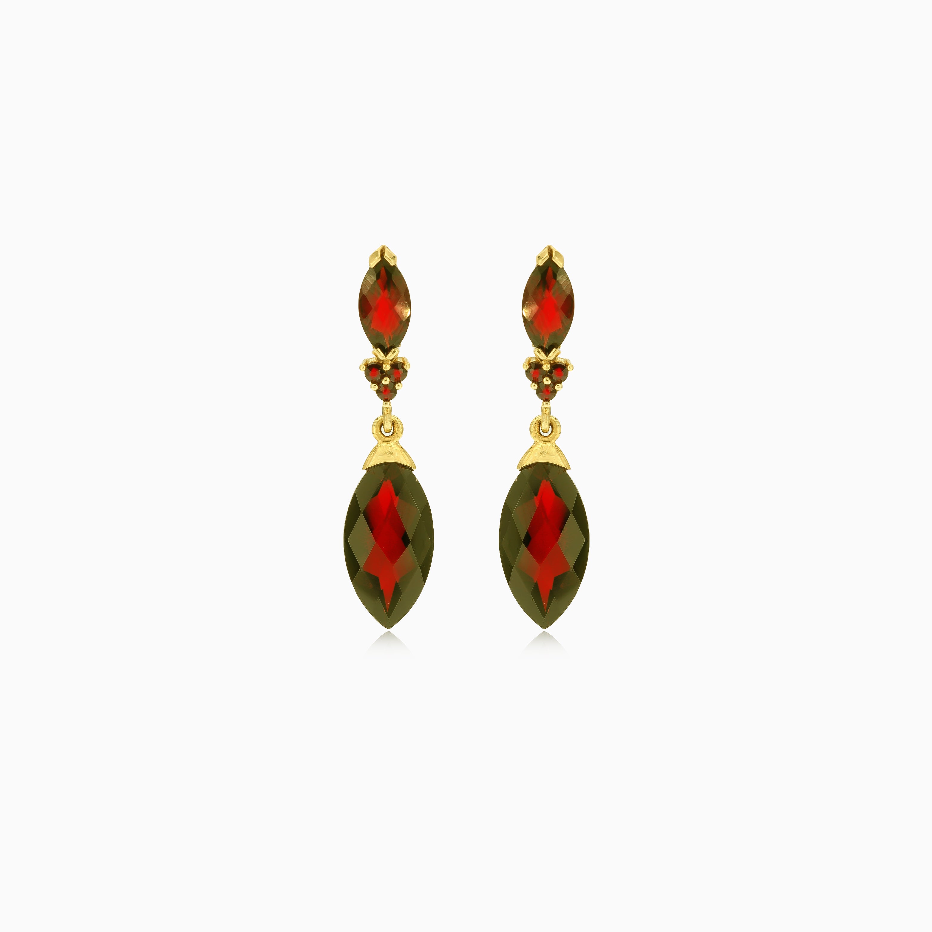 Élevez votre style avec ces boucles d'oreilles pendantes mettant en valeur des grenats taillés en marquise et ronde à fine étape. Confectionnées en or jaune 14 carats, elles présentent un fermoir à cliquet et un sertissage à griffes partagées, ajoutant une touche de sophistication et d'élégance intemporelle.
