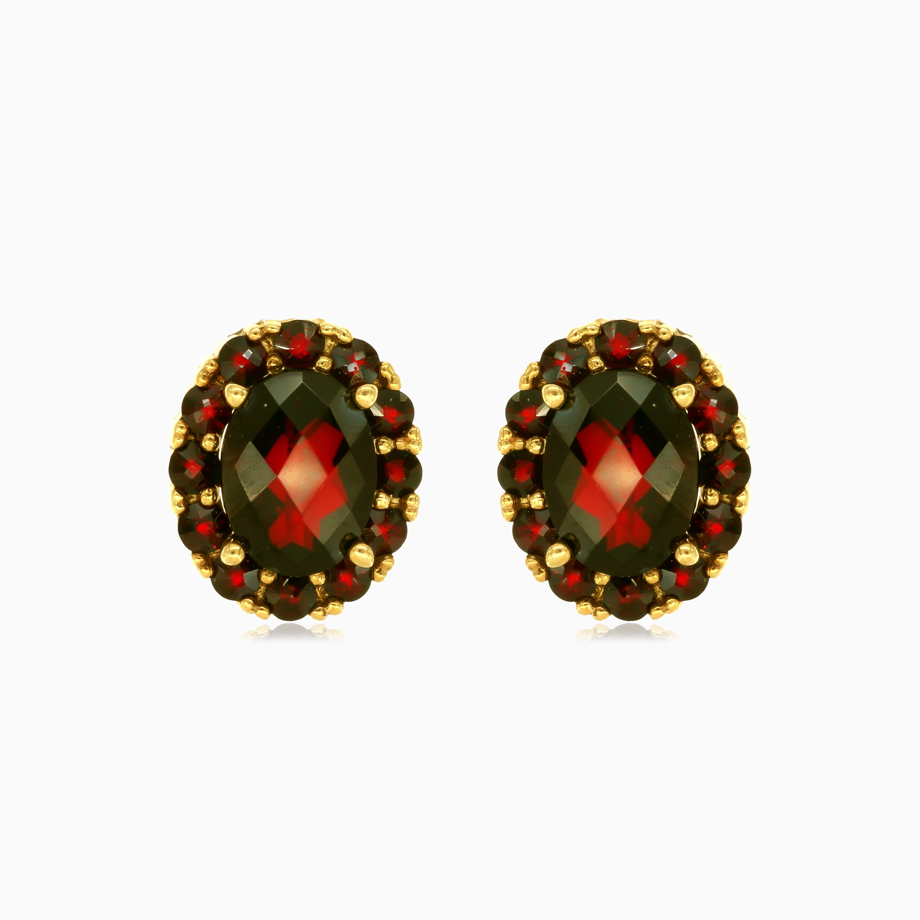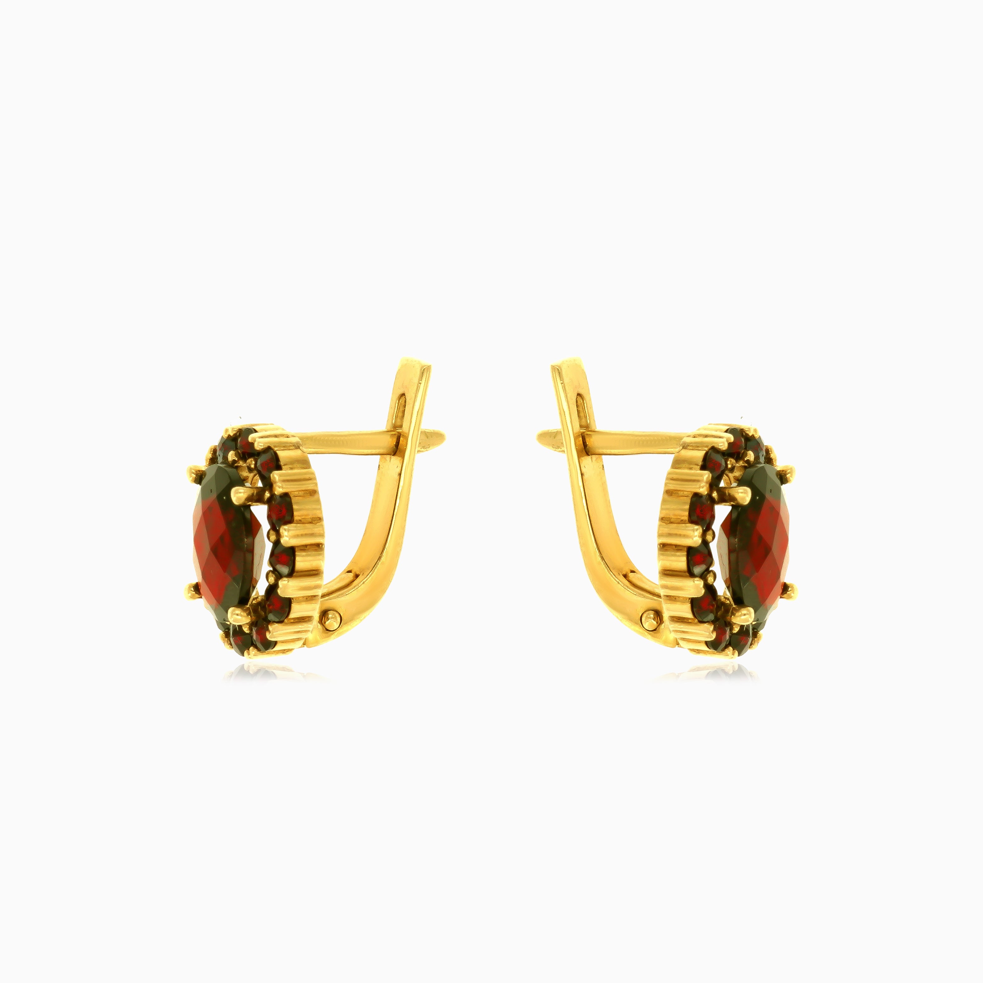 Élevez votre style avec ces magnifiques boucles d'oreilles en or jaune 14 carats, mettant en valeur un grenat ovale taillé en fine étape et des pierres rondes taillées en fine étape, toutes deux sécurisées dans un sertissage élégant à 4 griffes. Le fermoir à cliquet garantit un ajustement sécurisé et confortable, faisant de ces boucles d'oreilles un ajout parfait à votre collection de bijoux.
