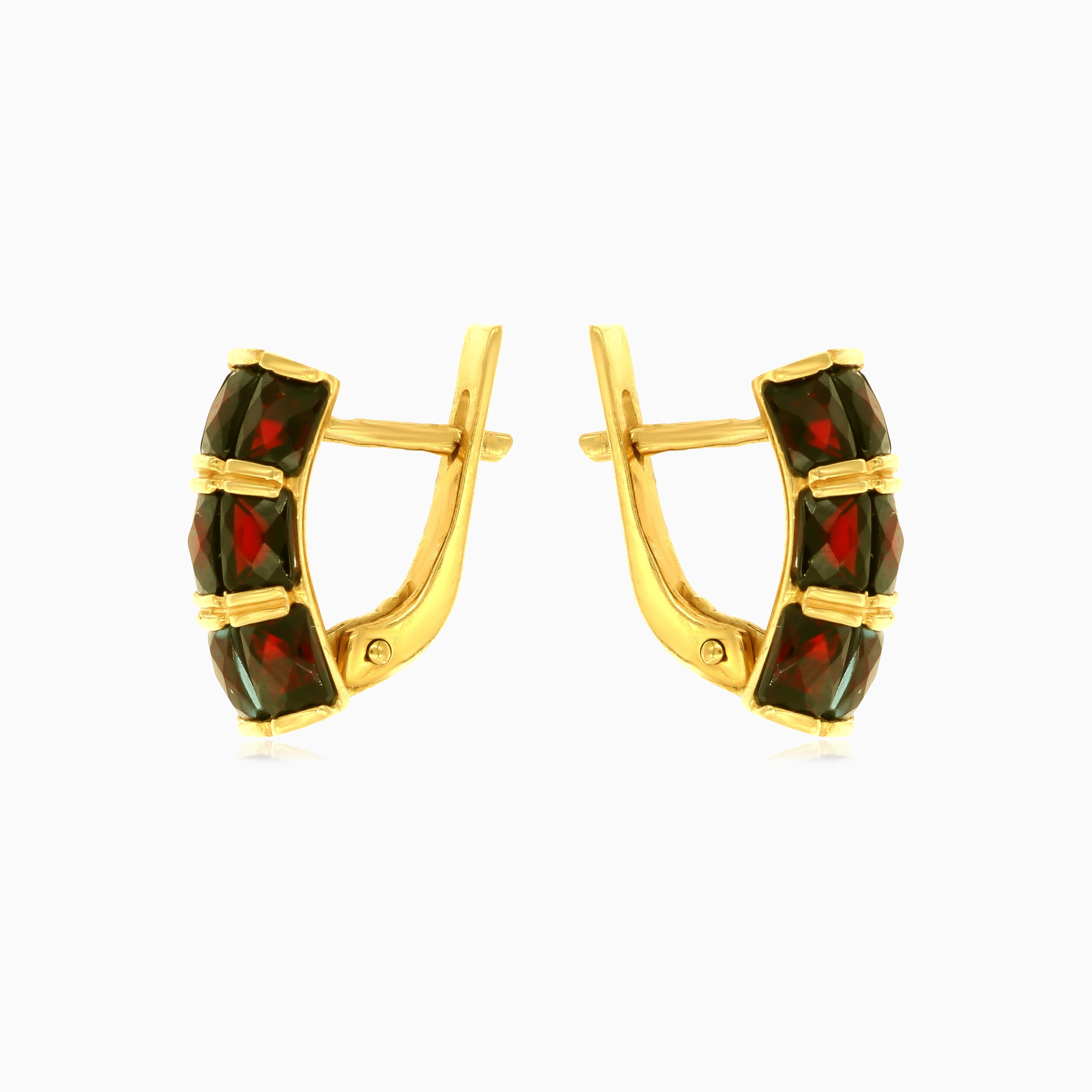 Élevez votre style avec ces superbes boucles d'oreilles pendantes en or jaune 14 carats, présentant trois rangées de trois grenats taillés en radiant rectangulaire, captivants. Le sertissage en barre et le fermoir à cliquet ajoutent une touche de sophistication.