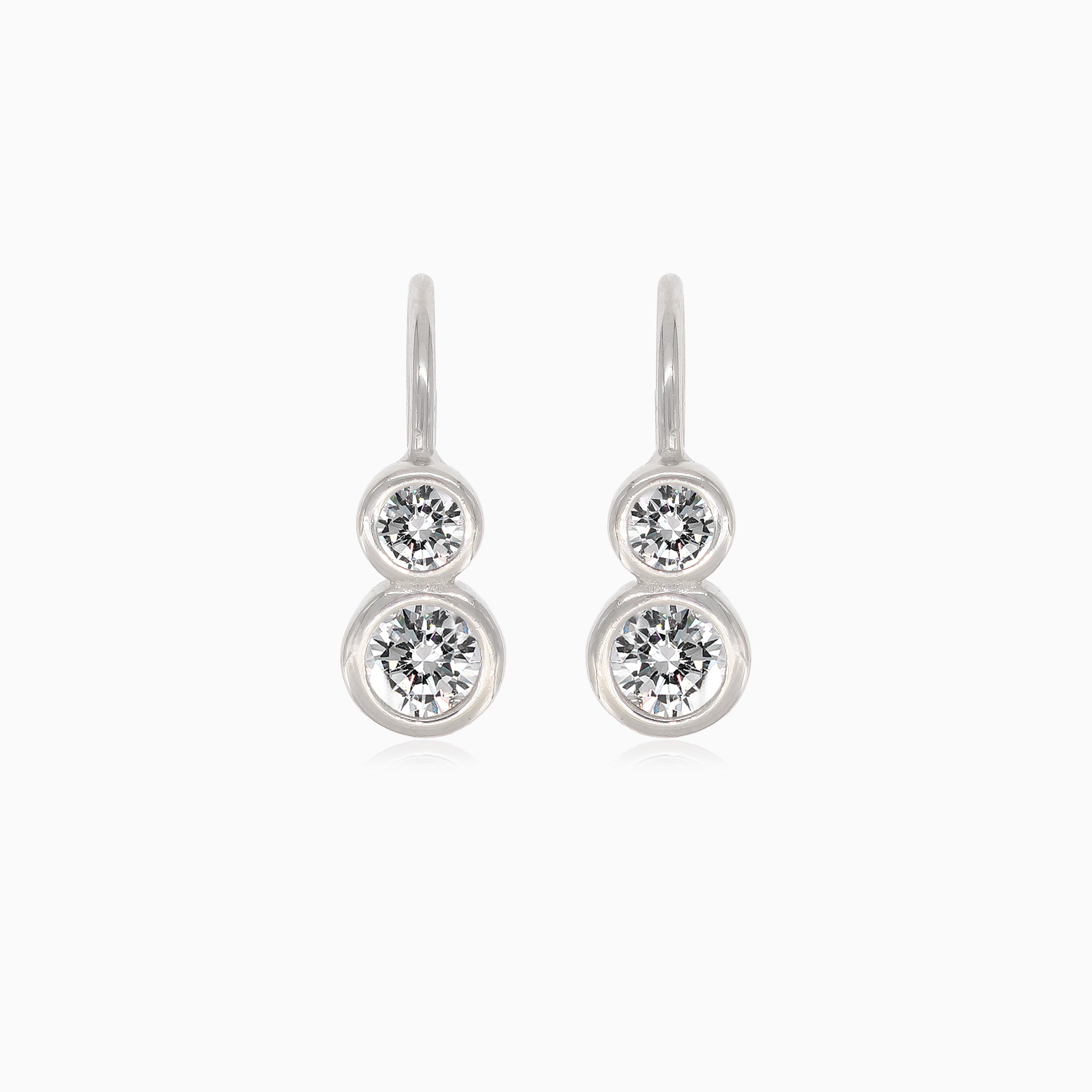 Apportez de l’élégance à votre tenue avec ces boucles d’oreilles pendantes en argent, ornées de deux éclatants zirconiums cubiques ronds, sécurisées par des fermoirs à levier.