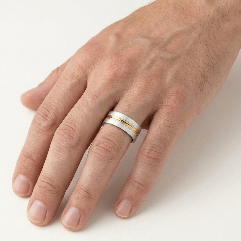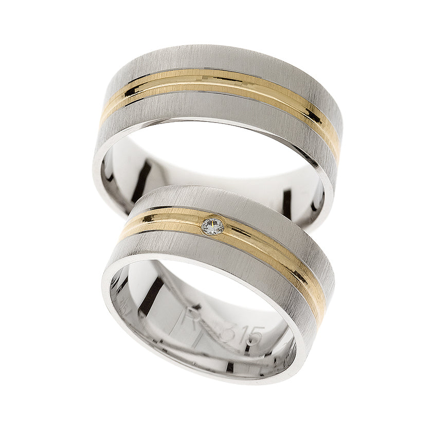 Découvrez nos superbes alliances en or blanc 14 carats pour hommes et femmes, avec une finition mate et une ligne sculptée en or jaune autour. La première bague peut être ornée d’une zircone cubique 0,03 ct ou d’un diamant en sertissage griffé rond taille fine. La seconde est simple. Les deux bagues ont une épaisseur de 8 mm, alliant sophistication et design unique.