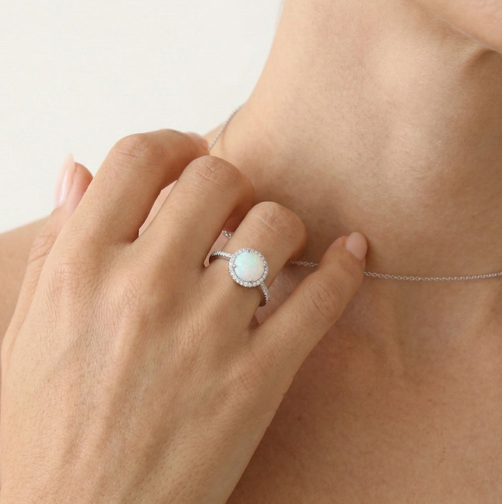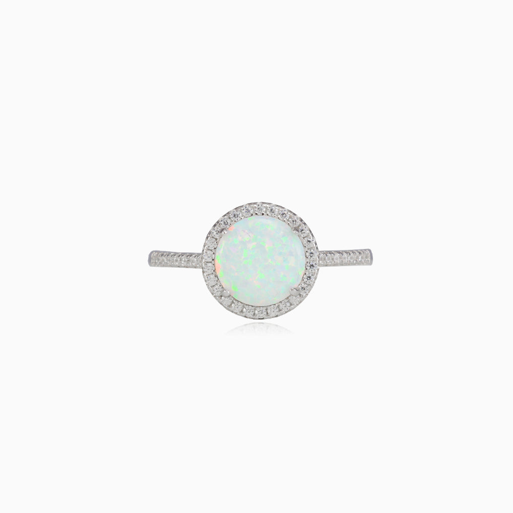 Bague royale en argent sterling combinée avec une opale blanche ronde et décorée d’un halo de zircone cubique.