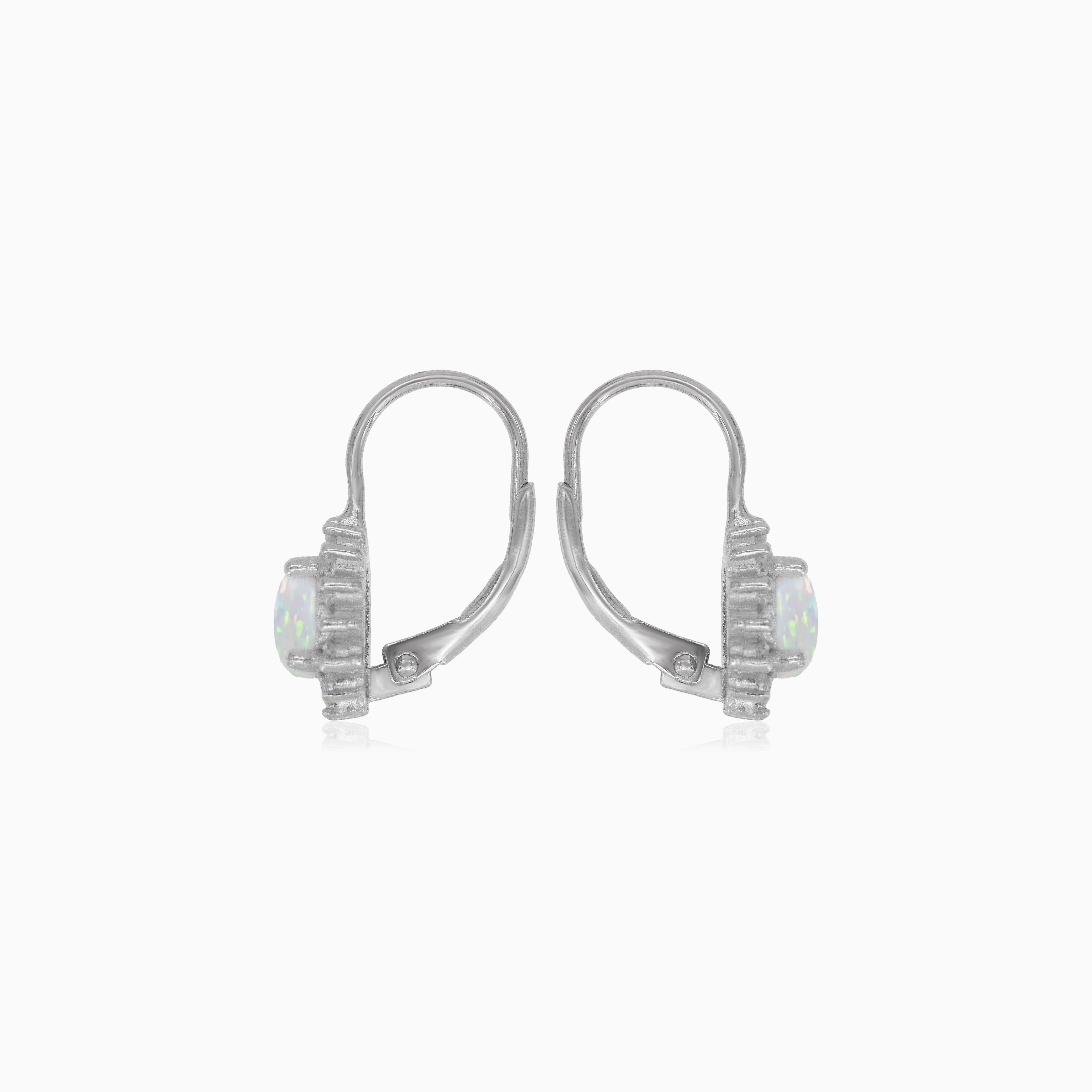 Ces boucles d’oreilles pendantes halo en argent sterling présentent une opale blanche taille ronde en serti clos sécurisé, créant un magnifique point focal. Agrémentées de zircon cubique rond taillé à degrés fins en serti griffé classique, elles offrent un éclat intemporel. Les fermoirs à levier garantissent un port confortable et sécurisé.