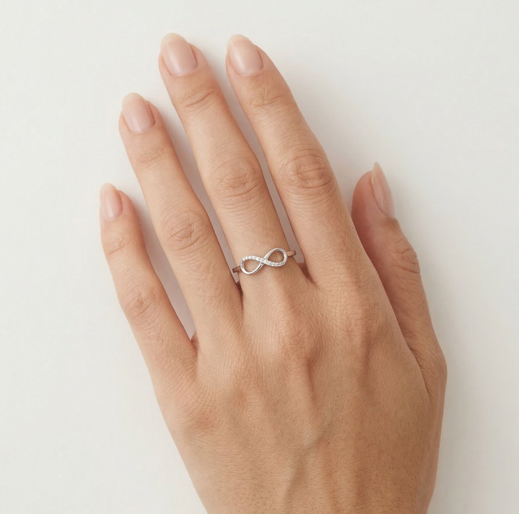 Bague en or blanc 14 carats décorée du symbole infini et de diamants de 0,04 ct avec un grade de pureté SI1 et une couleur H.