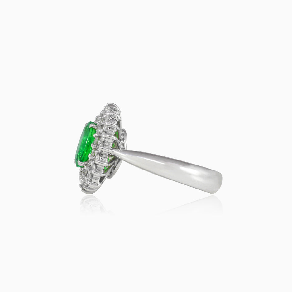 Bague spectaculaire en or blanc 18 carats, avec une émeraude ovale de première qualité, entourée d’un halo à deux rangées de 34 diamants taille brillant.