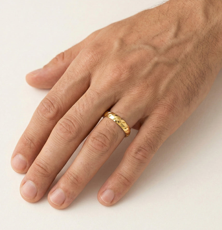 Cette alliance détaillée pour hommes et femmes est fabriquée en or jaune 14 carats, avec une épaisseur de 4 mm. Dotée d’une forme ronde basique et de côtés arrondis lisses, elle présente des détails raffinés qui ajoutent élégance et sophistication, faisant d’elle un symbole parfait d’amour durable.