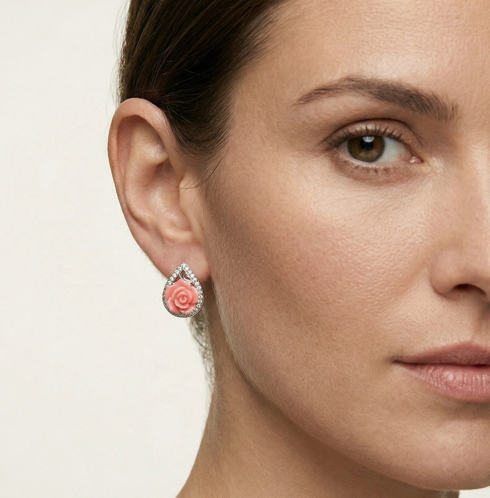 Boucles d’oreilles en forme de poire décorées de zirconiums cubiques, d’émail coloré et d’une rose centrale couleur pêche. Cette paire printanière est dotée d’un fermoir à cliquet.