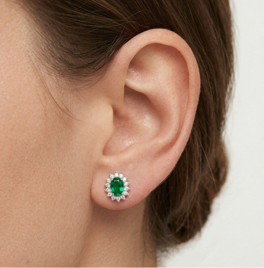 Boucles d’oreilles clous pour femme en argent sterling avec une émeraude synthétique de coupe ovale en taille ovale à degrés fins, entourée de zircons cubiques étincelants en taille ronde à degrés fins. Dotées d’un fermoir poussette sécurisé et serties de griffes durables, ces boucles d’oreilles ajoutent une touche d’élégance intemporelle à toute tenue.