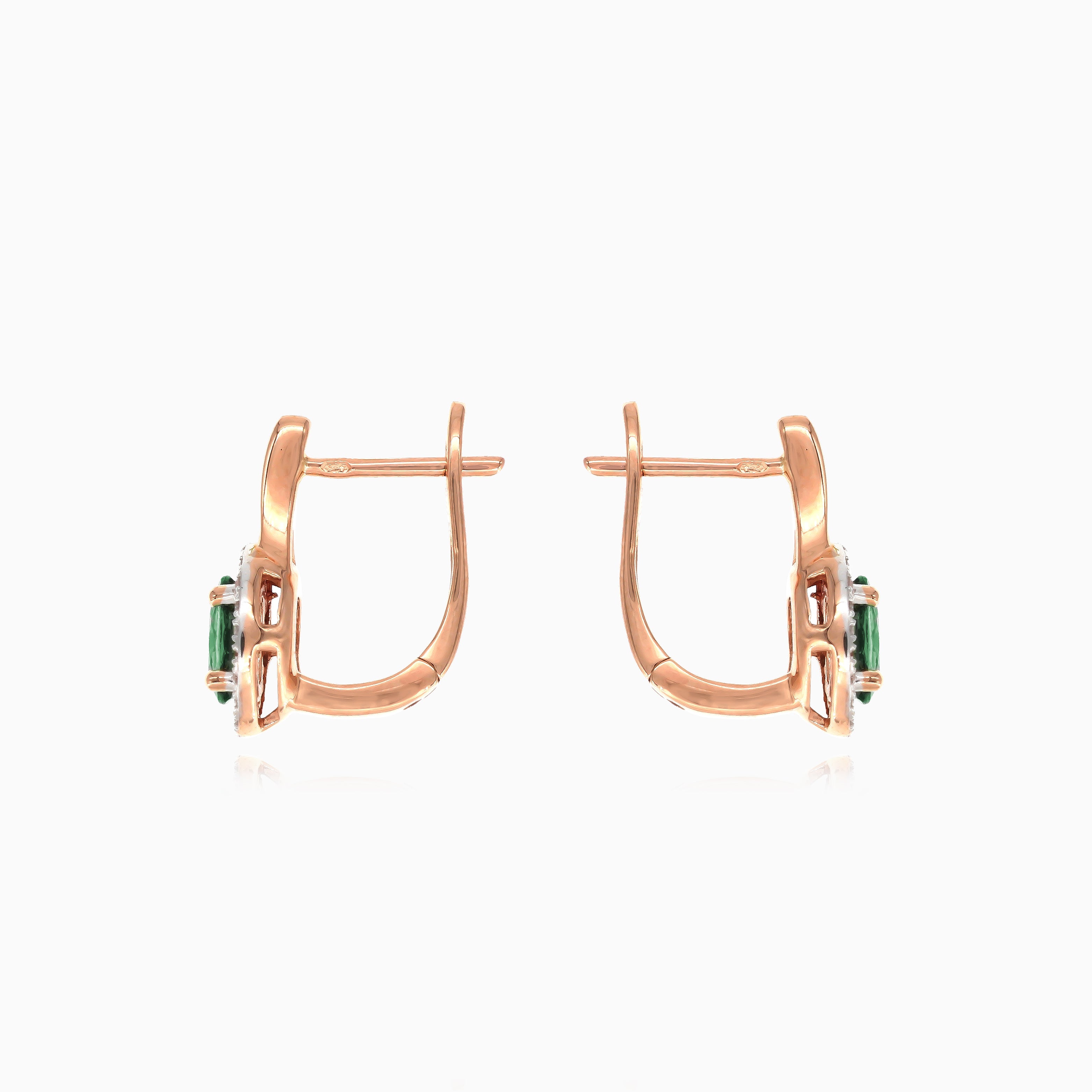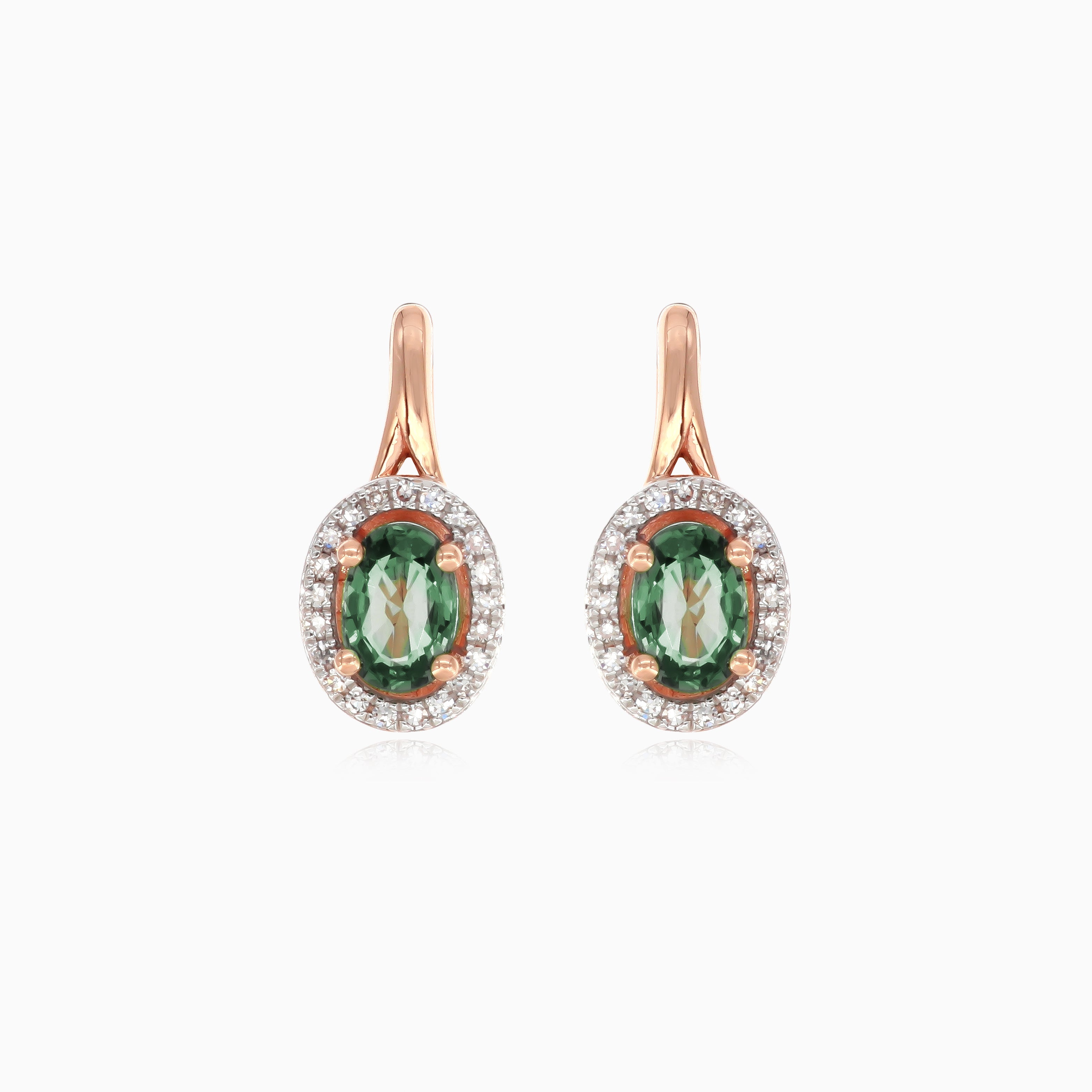 Illuminez votre style avec des boucles d’oreilles en or rose 14 carats, où un diamant brillant taille fine ronde rencontre un saphir vert taille ovale, élégamment maintenus par un fermoir à cliquet chic.