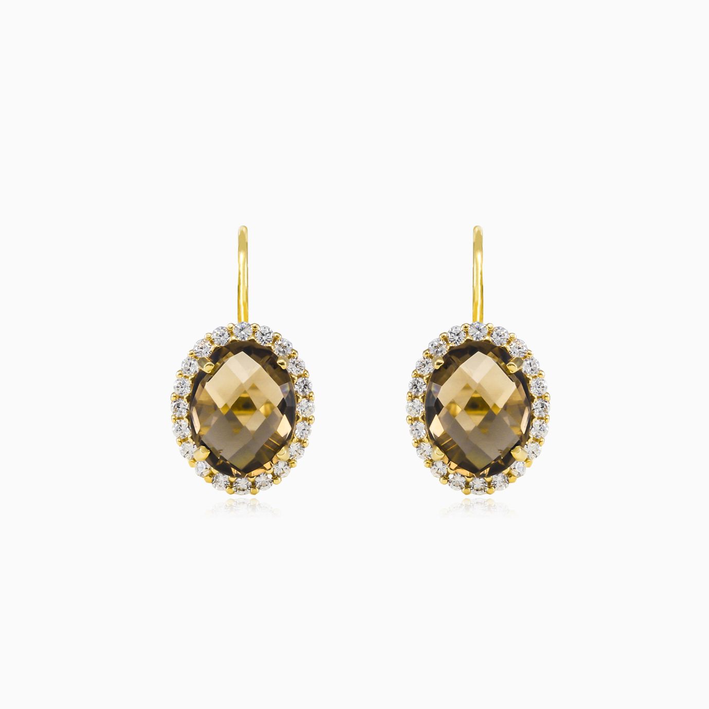 Boucles d’oreilles classiques en or jaune 14 carats, serties de topazes fumées taille ovale entourées d’un halo de zircones cubiques.