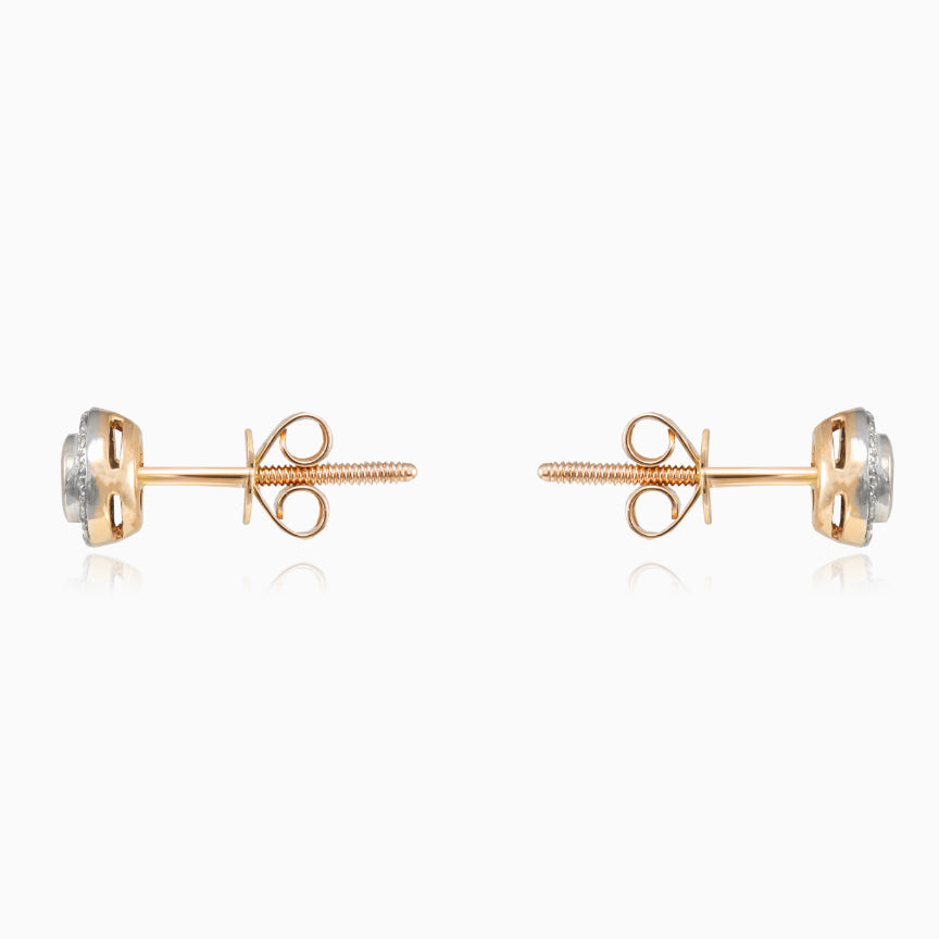 Boucles d’oreilles en or rose 14 carats avec rubis serti clos, entouré de diamants.