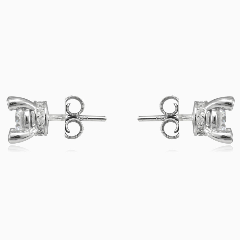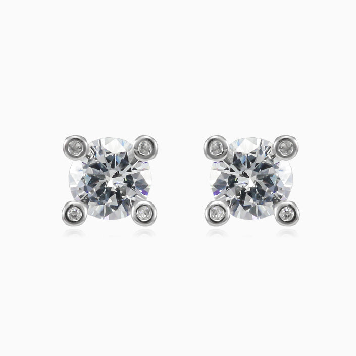 Boucles d’oreilles uniques en argent sterling, avec un zircon cubique central protégé par quatre griffes, chacune décorée d’un zircon cubique.