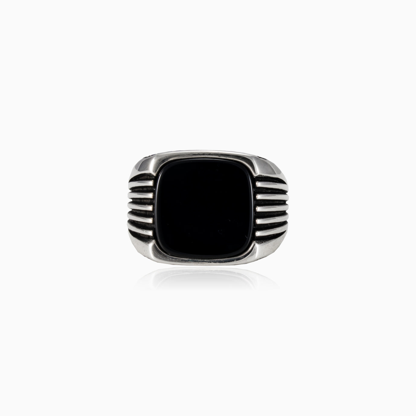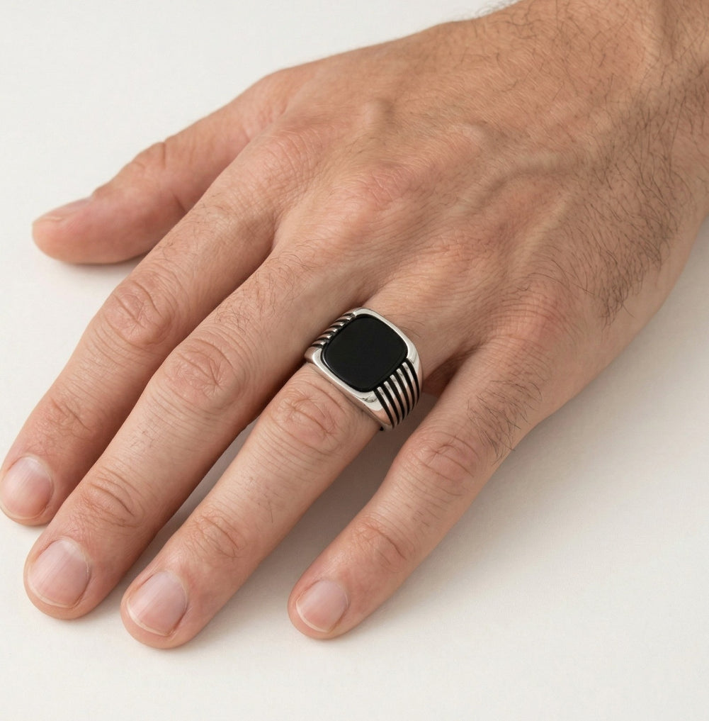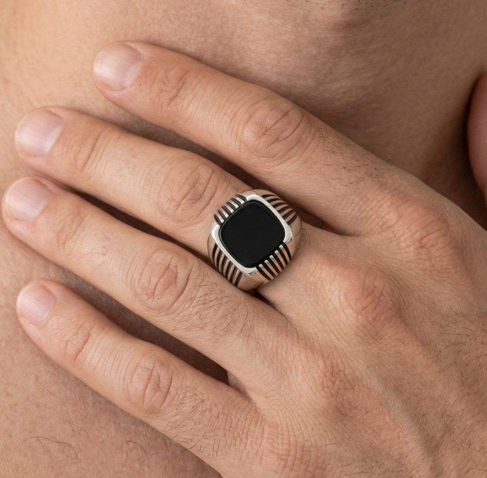Pánský stříbrný prsten s onyxem a bočními liniemi