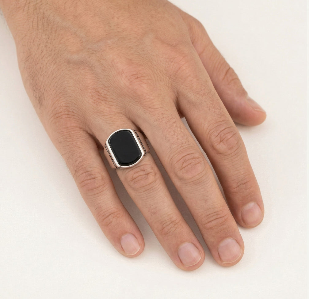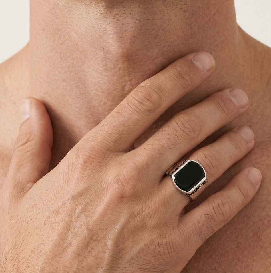 Pánský stříbrný prsten s onyxem a řeckým vzorem