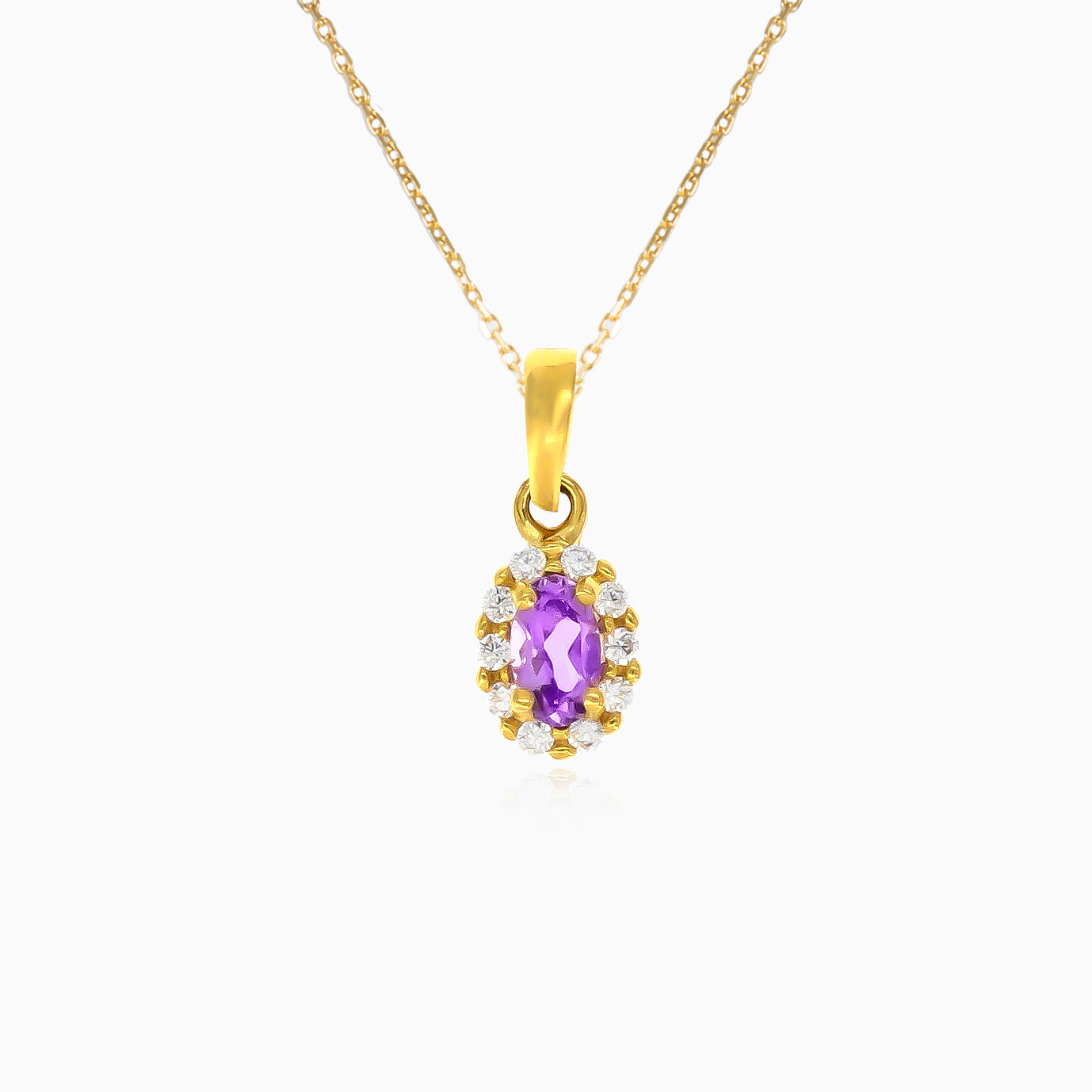Pendentif en or jaune avec améthyste taille ovale et halo de zirconium cubique.