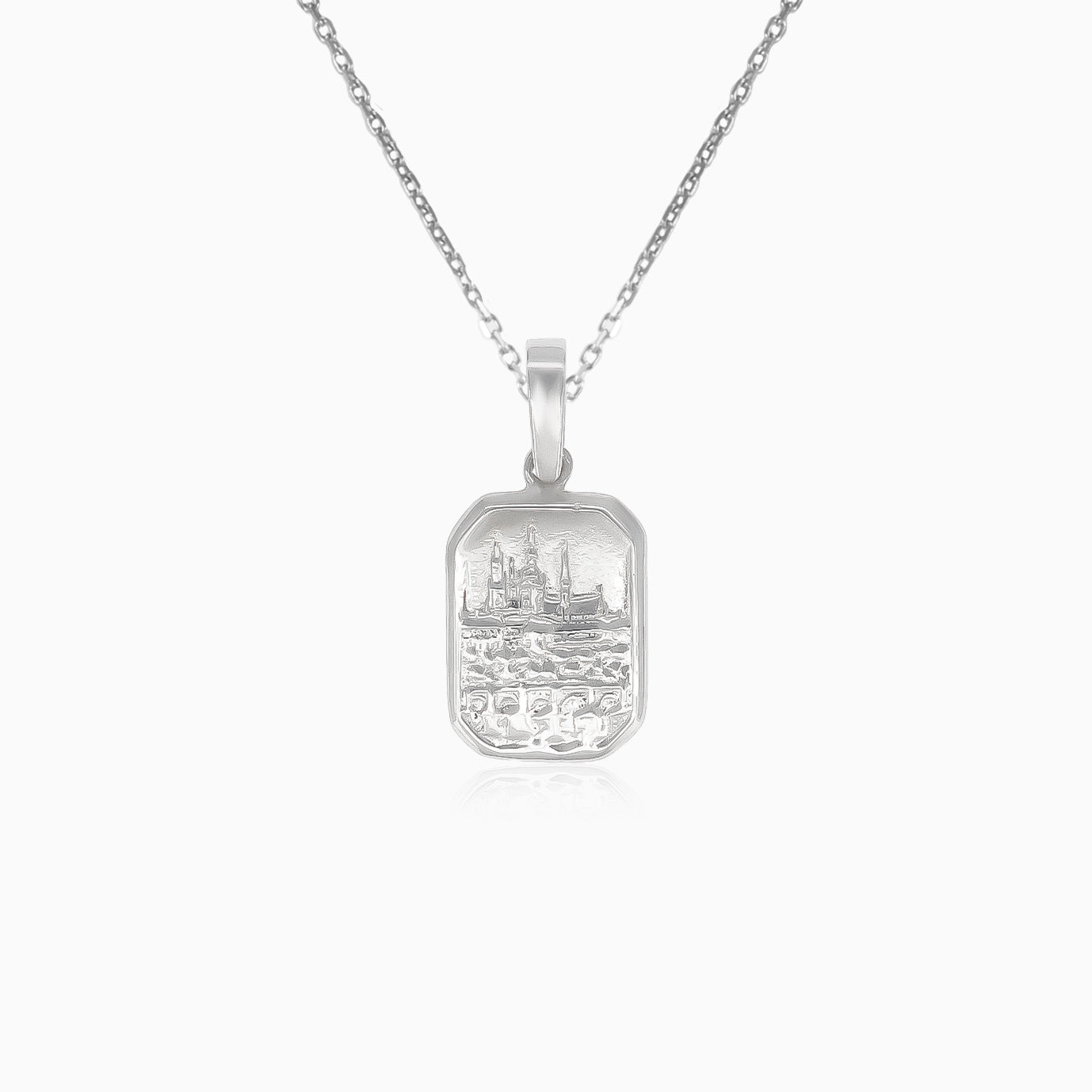 Ce pendentif en argent présente une plaque magnifiquement sculptée représentant l'emblématique ligne d'horizon de Prague, une pièce intemporelle pour commémorer votre amour pour la ville historique.