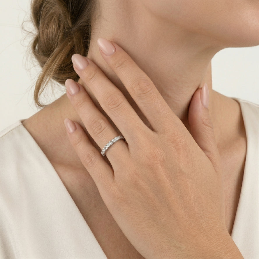 Cette superbe bague pour femme présente des zirconiums ronds taillés en pas-de-princesse, montés en argent avec un sertissage à griffes, offrant un éclat lumineux et un magnifique détail en forme de vague au centre.