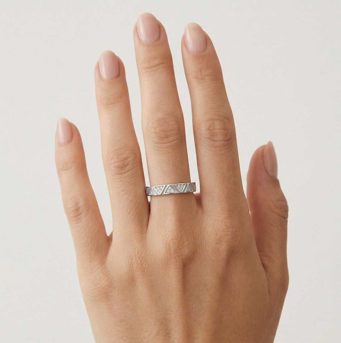 Sublimez votre style avec cette bague en argent pour femme, ornée de zirconiums en forme de triangles taillés en pas-de-princesse ronds, montés avec élégance sur un sert