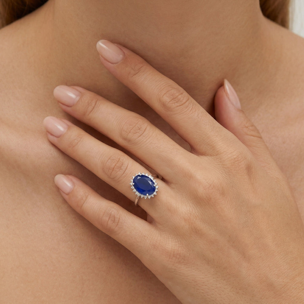 Bague halo en argent sterling avec saphir ovale.