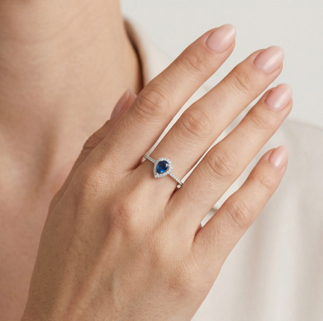 Cette magnifique bague halo en argent sterling présente un saphir synthétique poire taillé en escalier fin, serti de griffes. Autour du saphir, des zirconiums cubiques ronds taillés en escalier fin ajoutent une touche d’éclat, créant une pièce élégante qui brille avec raffinement. Idéale pour les occasions spéciales ou une élégance quotidienne.