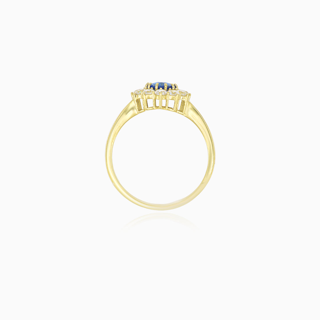 Cette élégante bague en or jaune 14 carats présente un magnifique saphir synthétique taille fine à gradins ovale, entouré de zircones cubiques étincelantes taille fine ronde à gradins. Le sertissage à griffes met en valeur la beauté des pierres, créant un design royal parfait pour toutes les occasions.