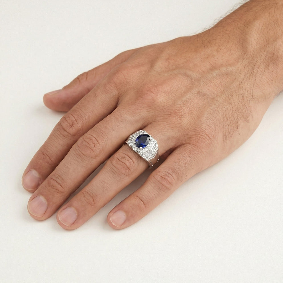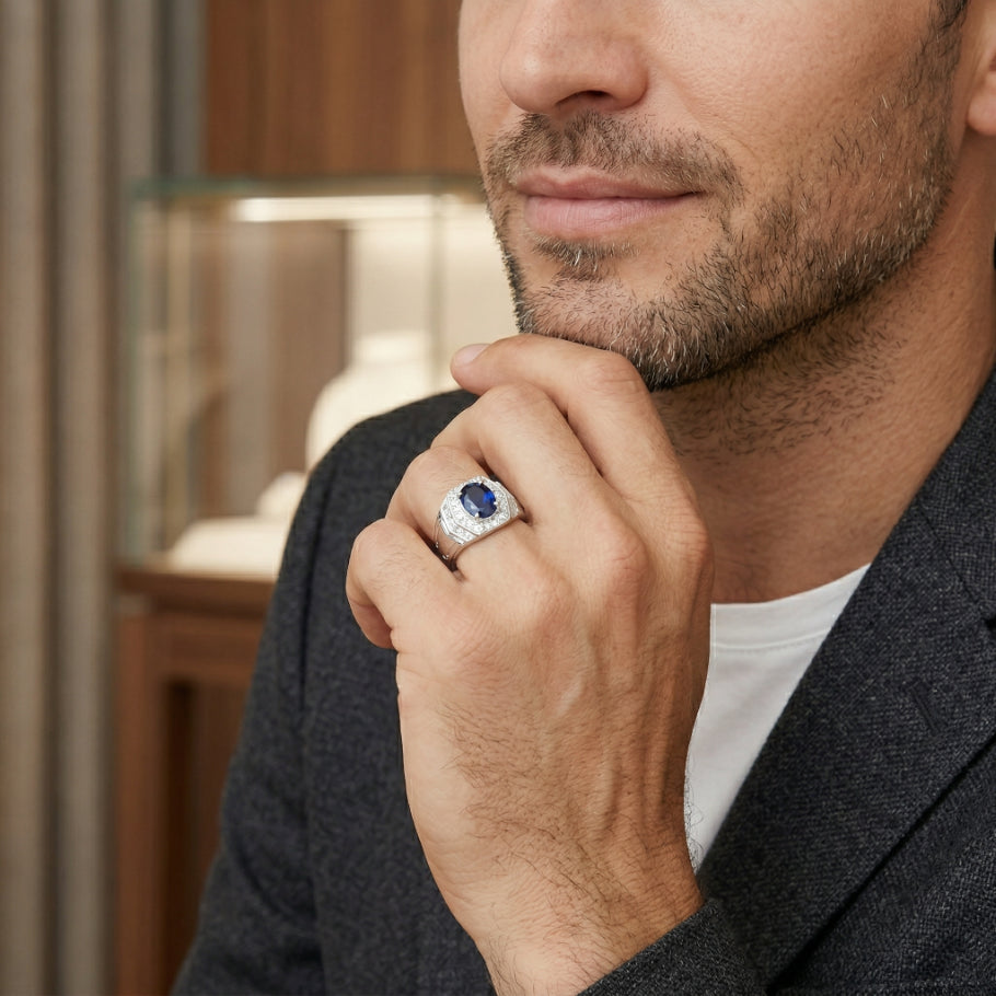 Tento jemný stříbrný prsten zvýrazňuje sytě modrý safír obklopený třpytivou halo obrubou. Navržen tak, aby zachytil světlo i emoce, přináší nádech elegance do okamžiků lásky, vděčnosti nebo osobních oslav.