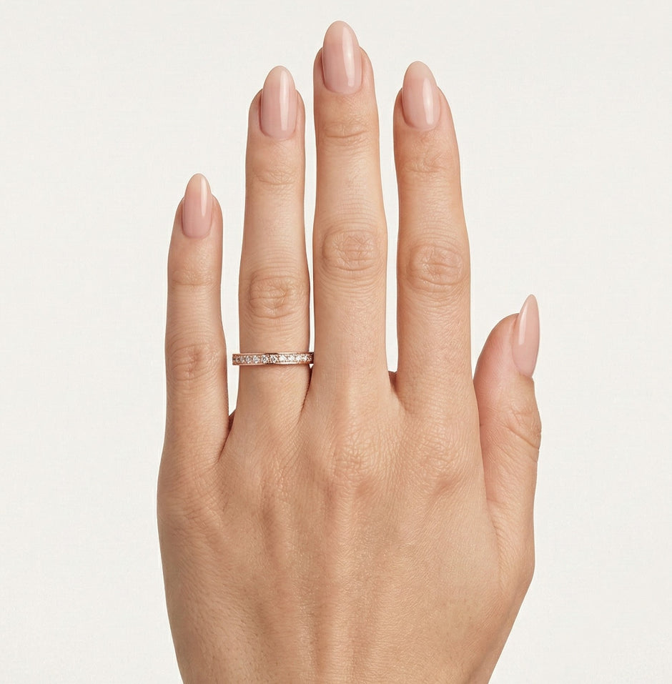 Cette élégante bague de mariage pour femme est réalisée en or rose 14 carats, avec une épaisseur de 2,1 mm. La bague présente un design simple et brillant, ornée de pierres fines rondes taillées en gradins de 0,19 ct en sertissage griffé. Disponible avec zircone cubique ou diamants en option, elle offre une élégance intemporelle et un éclat subtil.