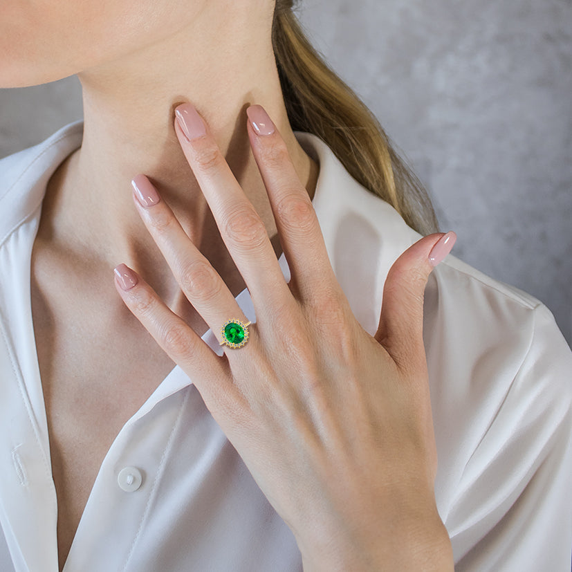 Bague captivante en or jaune 14 carats, ornée d’un quartz vert parfait entouré d’un halo d’oxydes de zirconium.