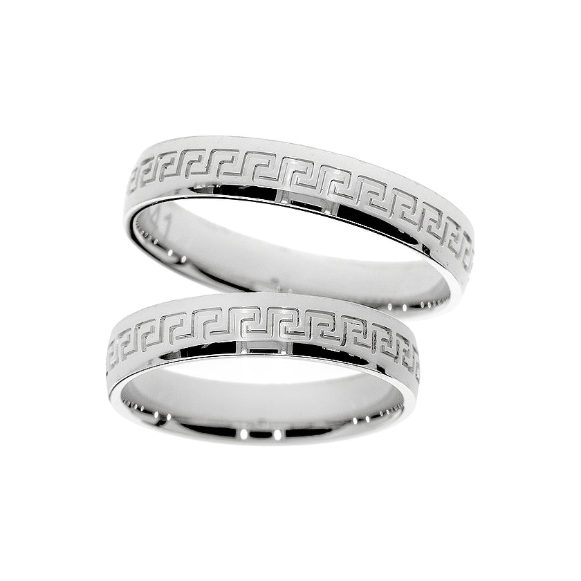 Alliance raffinée en or blanc 14 carats pour hommes et femmes, présentant un motif grec complexe autour de la bague. Avec une épaisseur de 4 mm, cette bague allie des éléments de design classique à une touche moderne. Parfaite pour ceux qui apprécient un savoir-faire détaillé et une élégance intemporelle dans leurs bijoux de mariage.